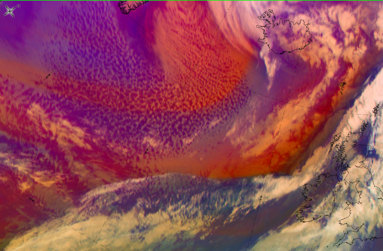 | Dust RGB | Ochre colours for closed and open cells for mid-level cloud; dark-red spots indicate thicker convection there. |