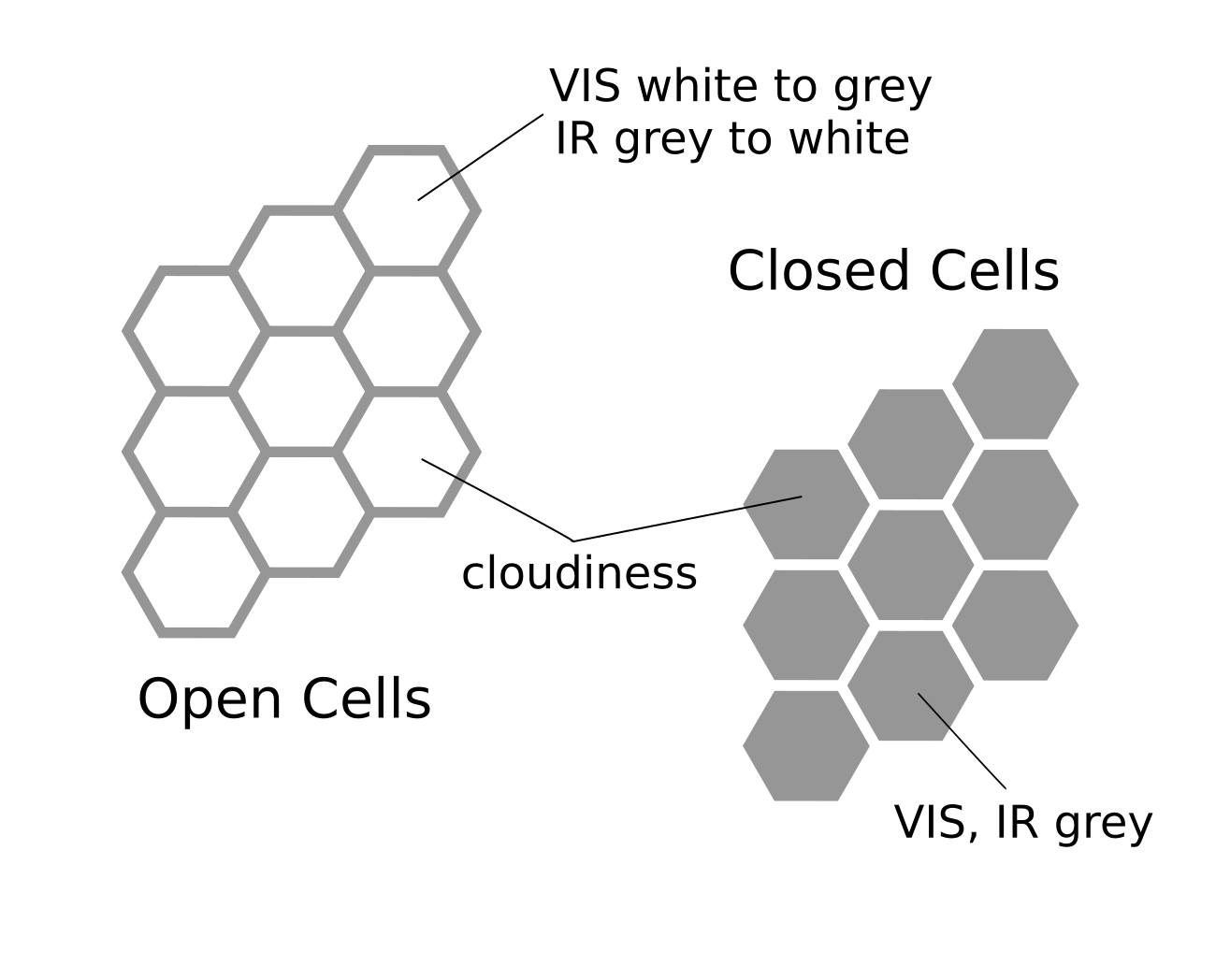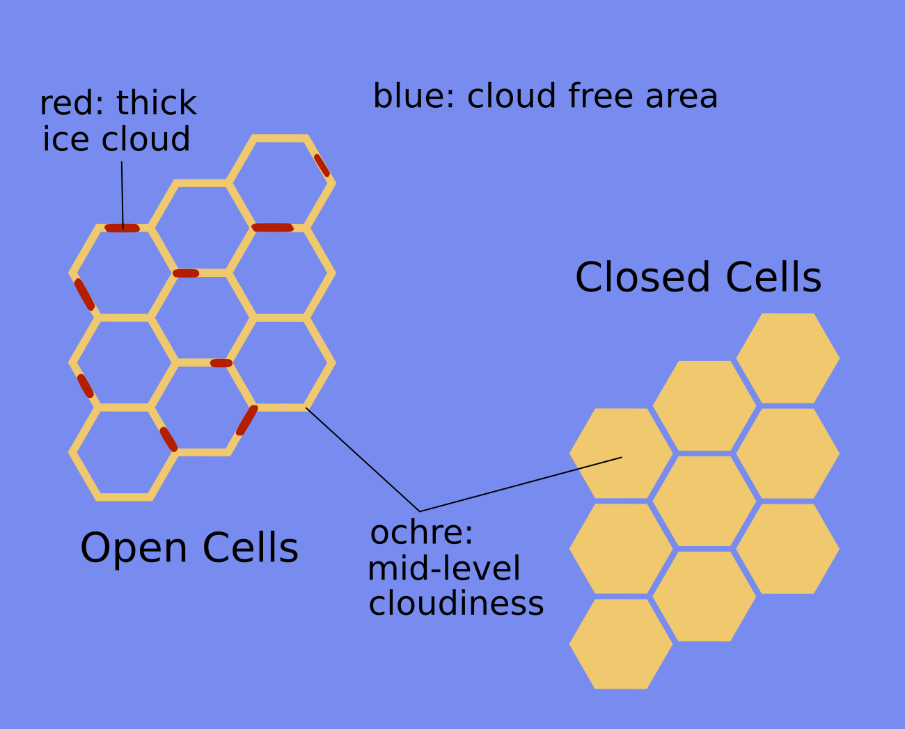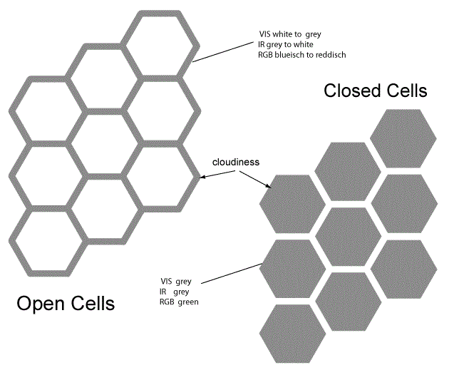 On satellite images, open and closed cells (OCs and CCs) appear as honeycomb-like (or hexagonal) patterns of cloudiness. In the case of open cells the centres are cloud free and the edges of the honeycomb are cloudy. In the case of closed cells the structure is reversed; the centres are cloudy and the edges are cloud free. The clouds of closed cells are in general shallower in depth than those of open cells. The diameters of the cells generally increase with increasing distance downstream.