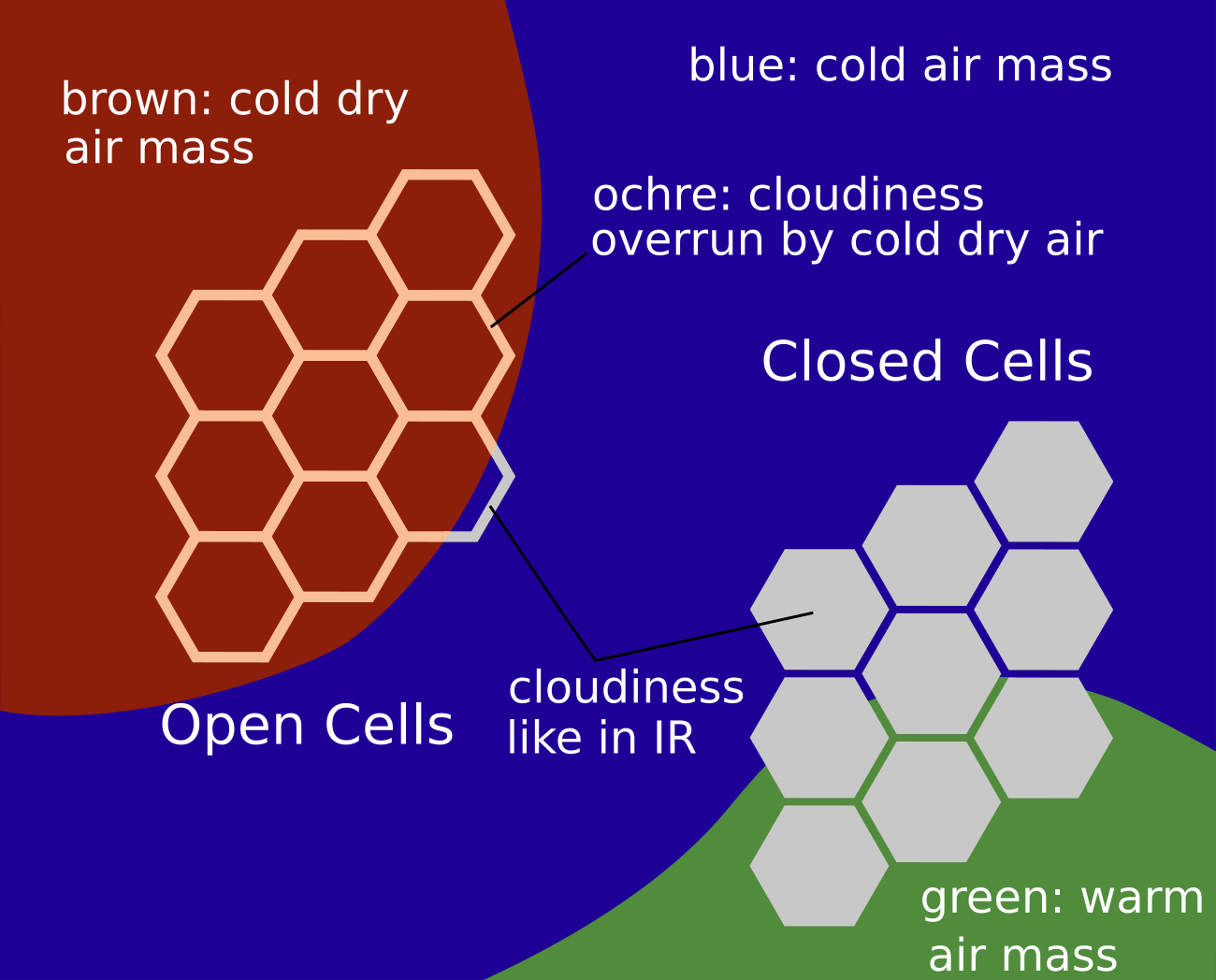 Open and closed cells both appear within a cold air mass. Therefore, there are blue and dark brown colours each for the cold and dry airmasses, respectively. While the open cells appear more to the north of the cold air, closed cells appear more in the southern or southwestern parts where airmasses are warmer. Therefore, open cells are usually overrun by dark brown or blue colours, while closed cells often appear under a greenish shadow.