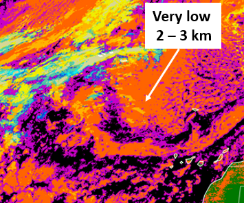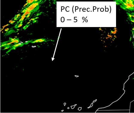 Land-based station reports at the eastern boundary of the open cell convection over land include showers with low-intensity rain. The precipitation probability of 65% there is rather high but decreases more to the west, over the Atlantic.