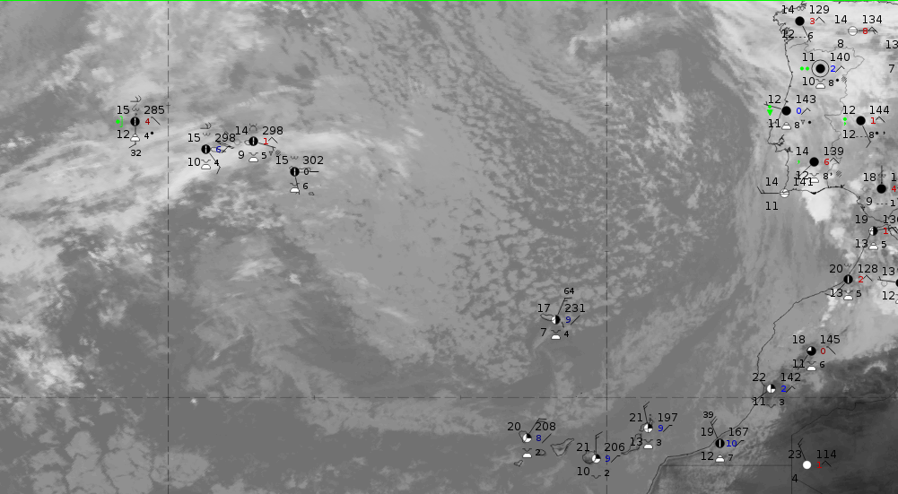 Station reports from Madeira and the Azores show high cloud cover values but no rain nor any showers. The precipitation probabilities are less than 5 %.