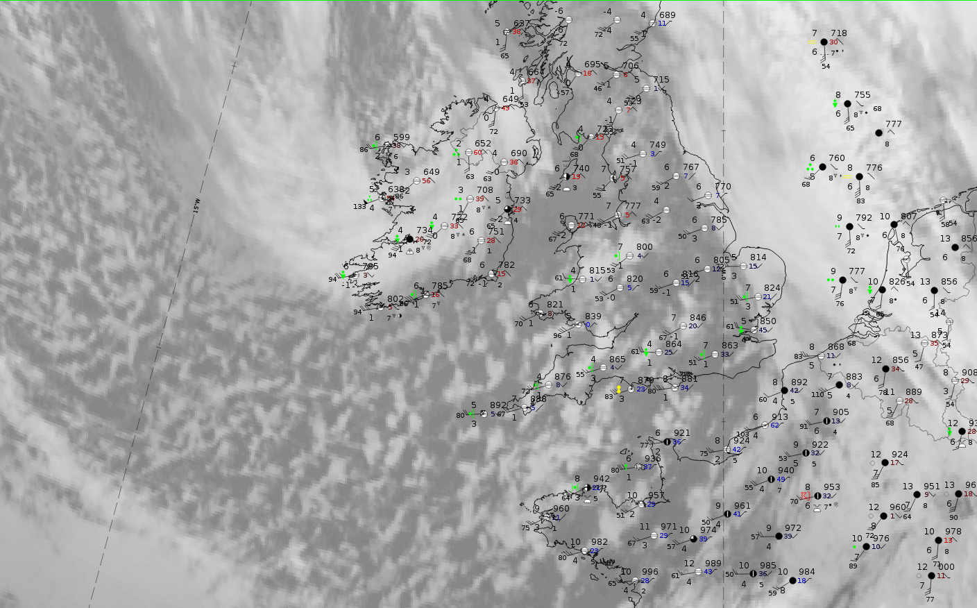 Legend: 29 February 2020 at 12UTC: IR + synoptic measurements (above) + probability of moderate rain (Precipitting clouds PC - NWCSAF).