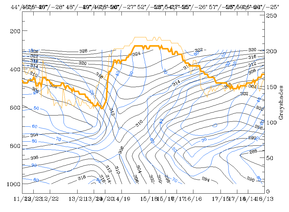 21 October 1996/18.00 UTC - Vertical cross section; black: isentropes (ThetaE), blue: relative humidity, orange thin: IR pixel values, orange thick: WV pixel values