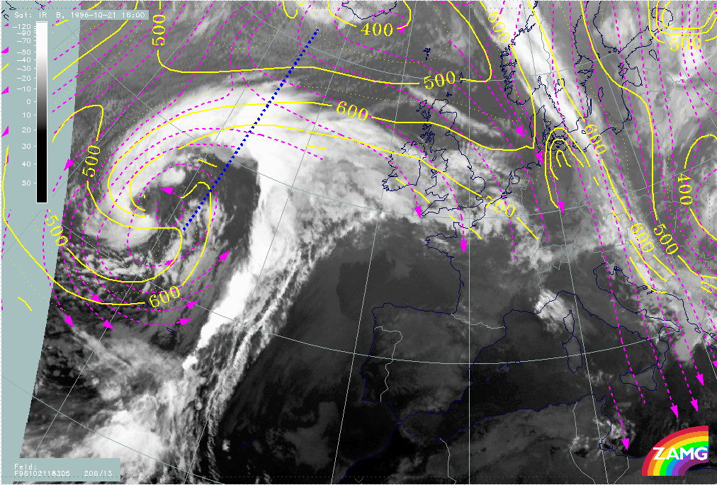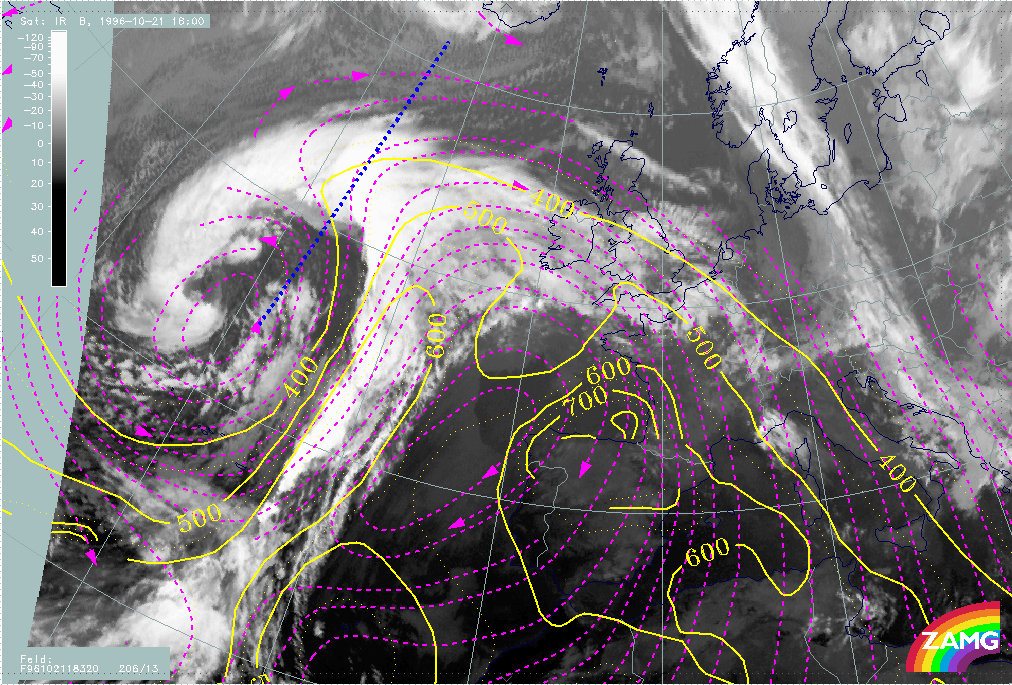 21 October 1996/18.00 UTC - Meteosat IR image; magenta: relative streams 305K - system velocity: 206° 13 m/s, yellow: isobars 305K, position of vertical cross section indicated