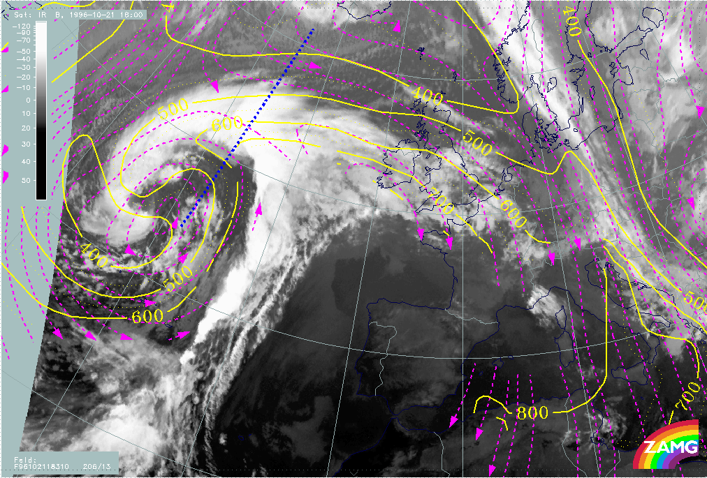 21 October 1996/18.00 UTC - Meteosat IR image; magenta: relative streams 310K - system velocity: 206° 13 m/s, yellow: isobars 310K, position of vertical cross section indicated
