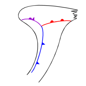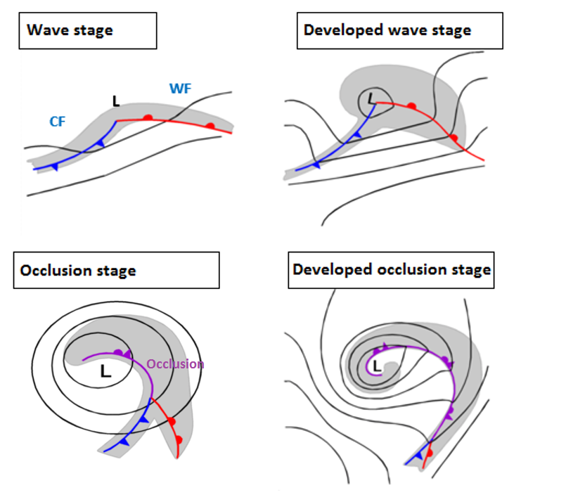 The classical development of an Occlusion (Warm conveyor Belt Type) is described in the well-known Polar Front theory after Bergeron, Bjerknes and Solberg with a development sequence from a Wave Stage to an Occlusion Stage.