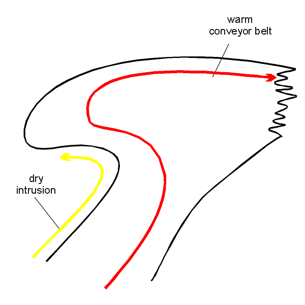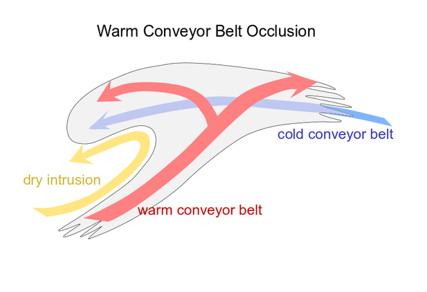The fact that the dry intrusion does not cross the Occlusion cloud band in this warm conveyor belt development type is another big difference from the Cold Conveyor Belt Type Occlusion
