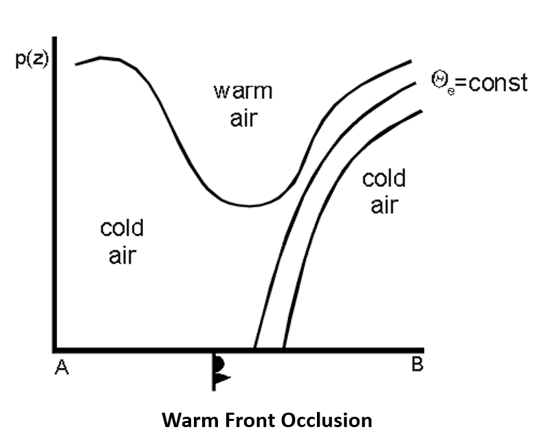 • If the air situated in front of the Warm Front is colder than the air behind, a so-called Warm Front Occlusion develops which has a forward inclined frontal surface