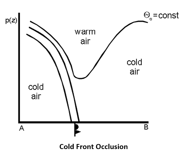 • If the air situated in front of the Warm Front is warmer than the air behind, a so-called Cold Front Occlusion develops which has a backward inclined frontal surface