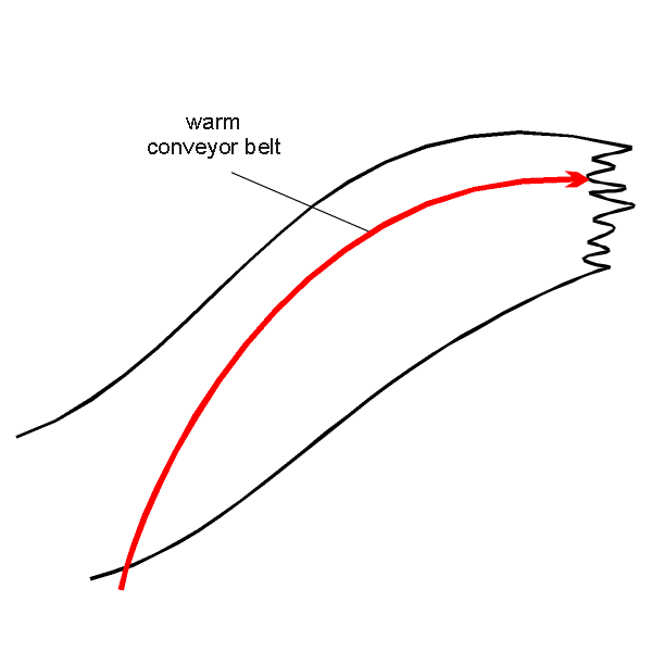 The structure and formation of the cloud spiral of the Warm Conveyor Belt Occlusion type can also be described with the conveyor belt theory (Link to the theory chapter in Basics) as follows.