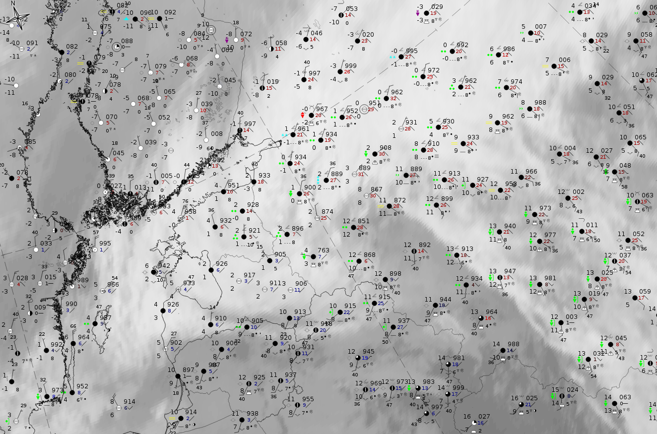 5 November 2019 at 12UTC: IR + synoptic measurements (above) + probability of moderate rain (Precipitting clouds PC - NWCSAF).