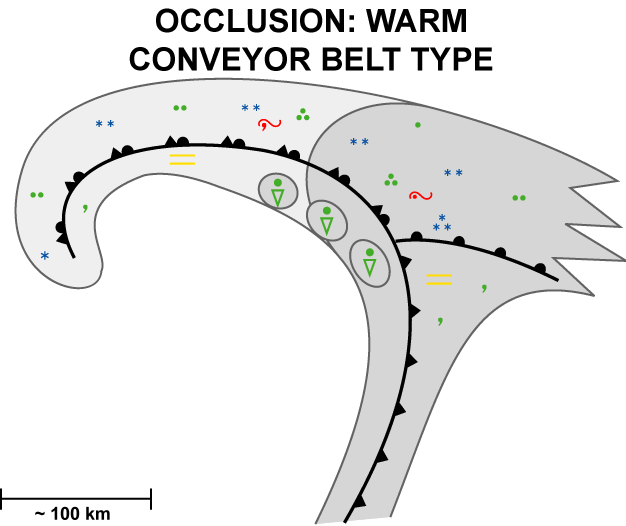 • Broad precipitation bands (5-50 km wide) are found within, and ahead of, the surface front. Maximum precipitation occurs close to the occlusion point (in contrast to occlusion: cold conveyor belt type).