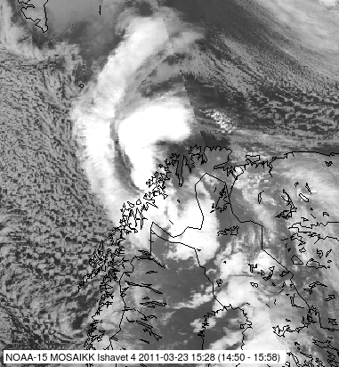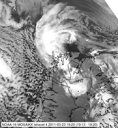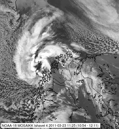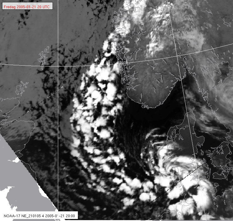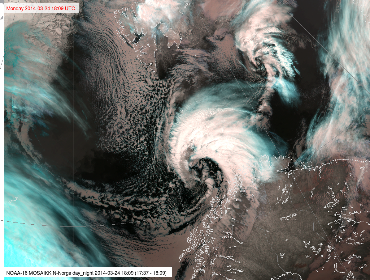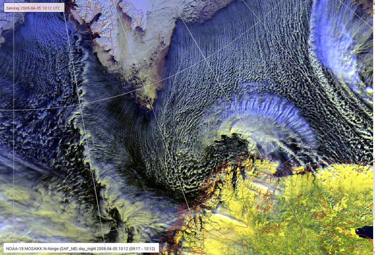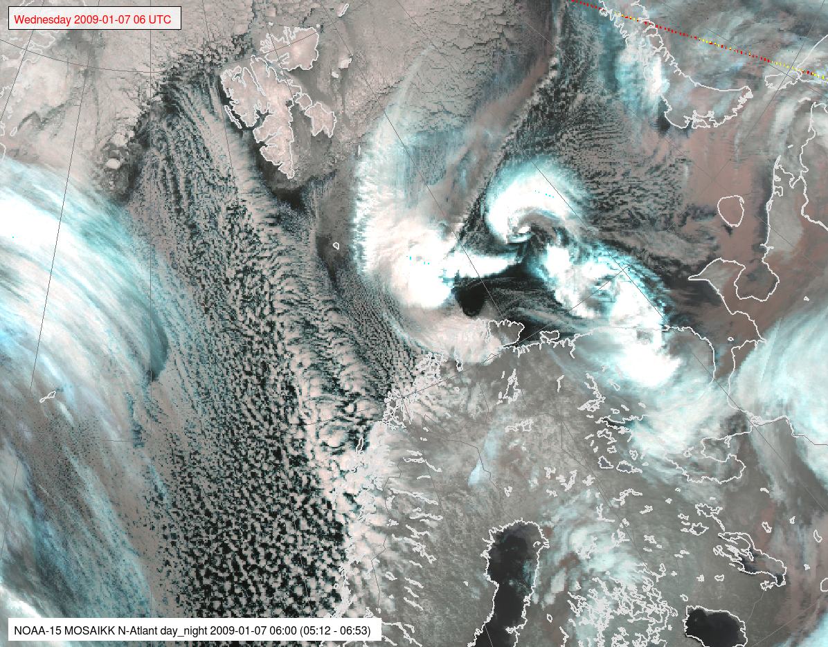 Polar Lows are small, but fairly intense maritime cyclones that form poleward of the polar front (Rasmussen and Turner, 2003). The horizontal scale of the polar low is approximately 150 to 600 kilometers, and sustained wind at 10 meter height is near or above gale force (>13,8 m/s). On average, maximum observed wind is at 22 m/s. Polar lows are a wintertime phenomenon that occurs mainly from October until April. Because of their northerly position, their small scale and their appearance in the dark winter season, AVHRR IR or day/night channel 3-4-5 images are the best way to detect Polar Lows. At latitudes lower than 68 degrees north, Meteosat IR are also useful for detecting such systems.