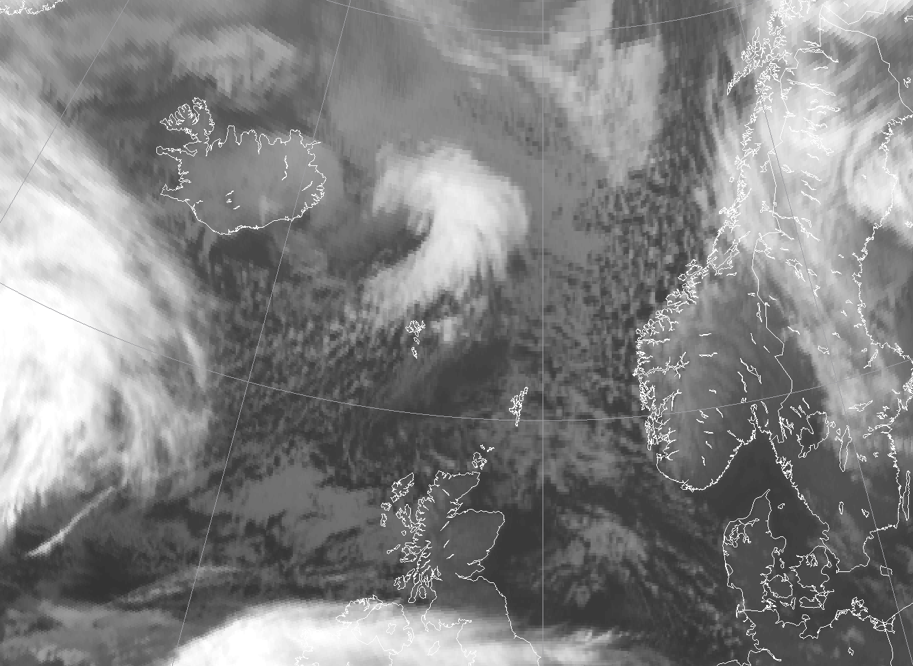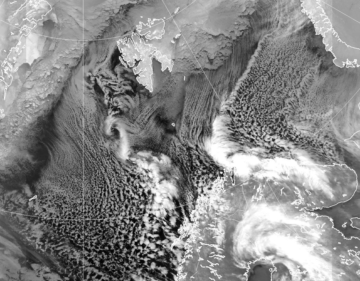 Figure 1.4: An Arctic front or convergence line extending westwards from Spitsbergen is curling up and starting to grow into a Polar Low. The eye and the cyclonic curvature is what distinguishes it from a trough or convergence line. Very white clouds west of Spitsbergen shows that this air mass is very cold and has potential for deep convection and Polar Lows. Illustration: MET-Norway/NOAA.