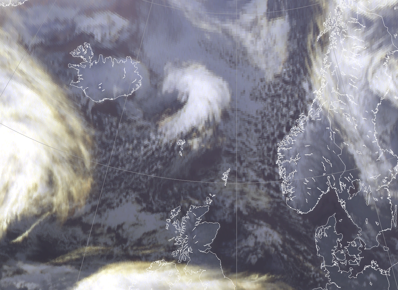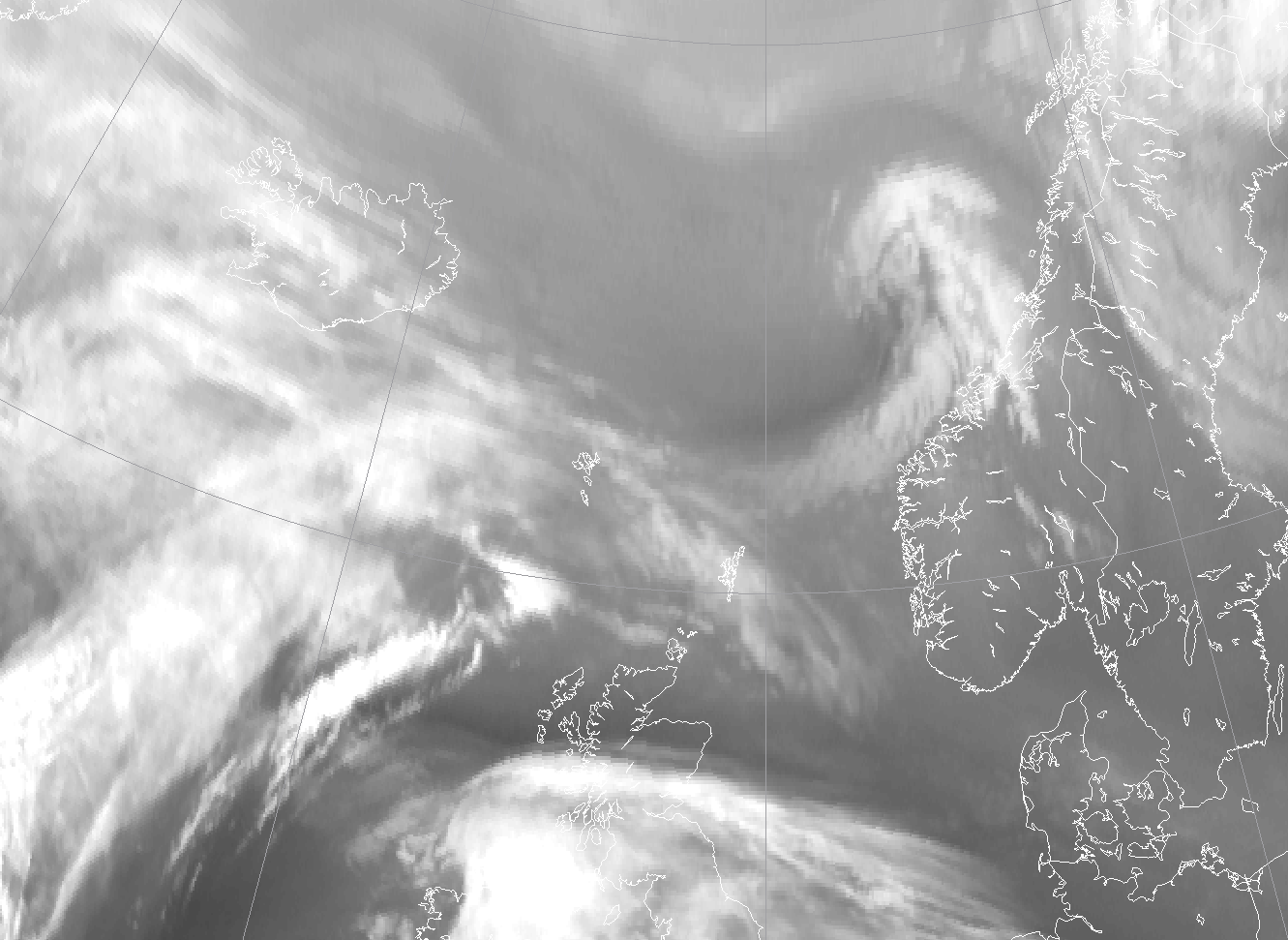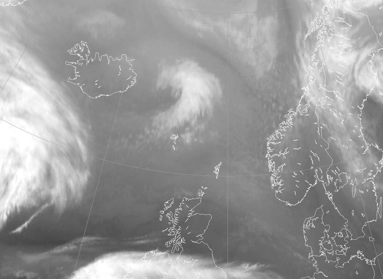 | WV | Cloud features are light grey; behind the polar low there is a dark grey area to the west. Northwest to the rearward edge of the comma spiral there is sinking stratospheric air. |
