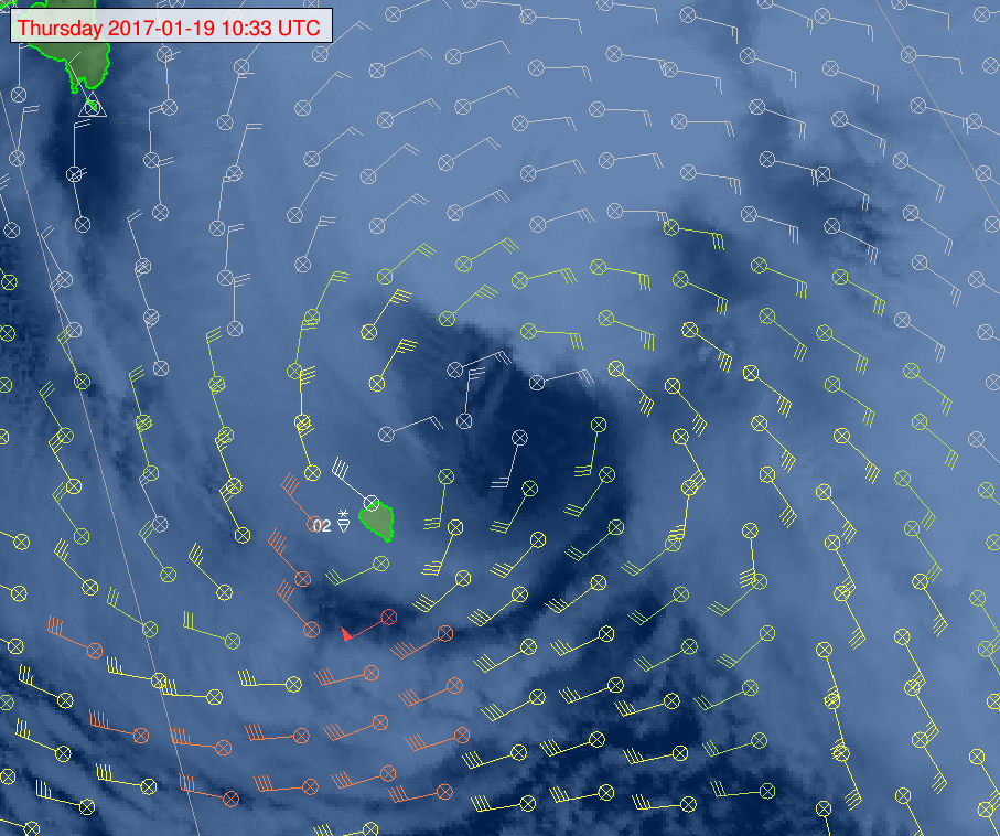 | IR | Distinct white comma spiral; innermost part of the comma head is light grey, representing warmer temperatures. |
