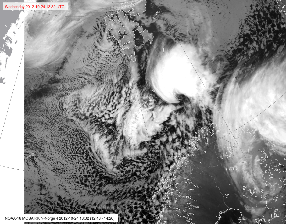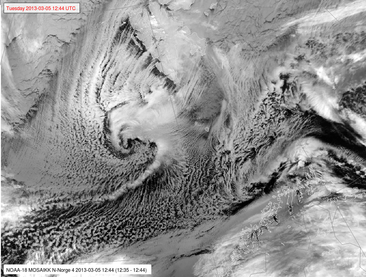 Figure 1.9: A shallow polar low north of the Finnmark coast, with unusually large wavelike cloud pattern around the center. Illustration: MET-Norway/NOAA