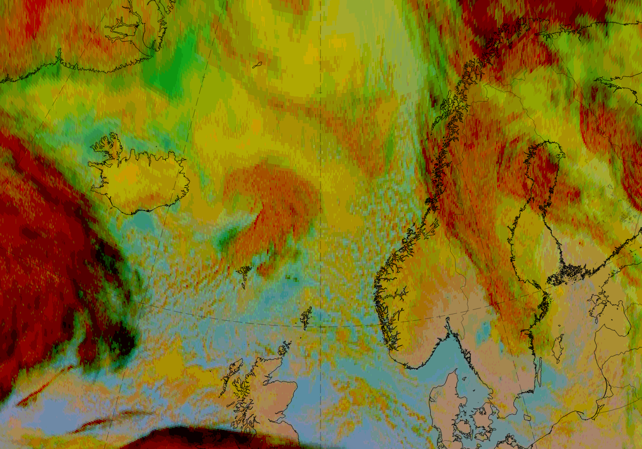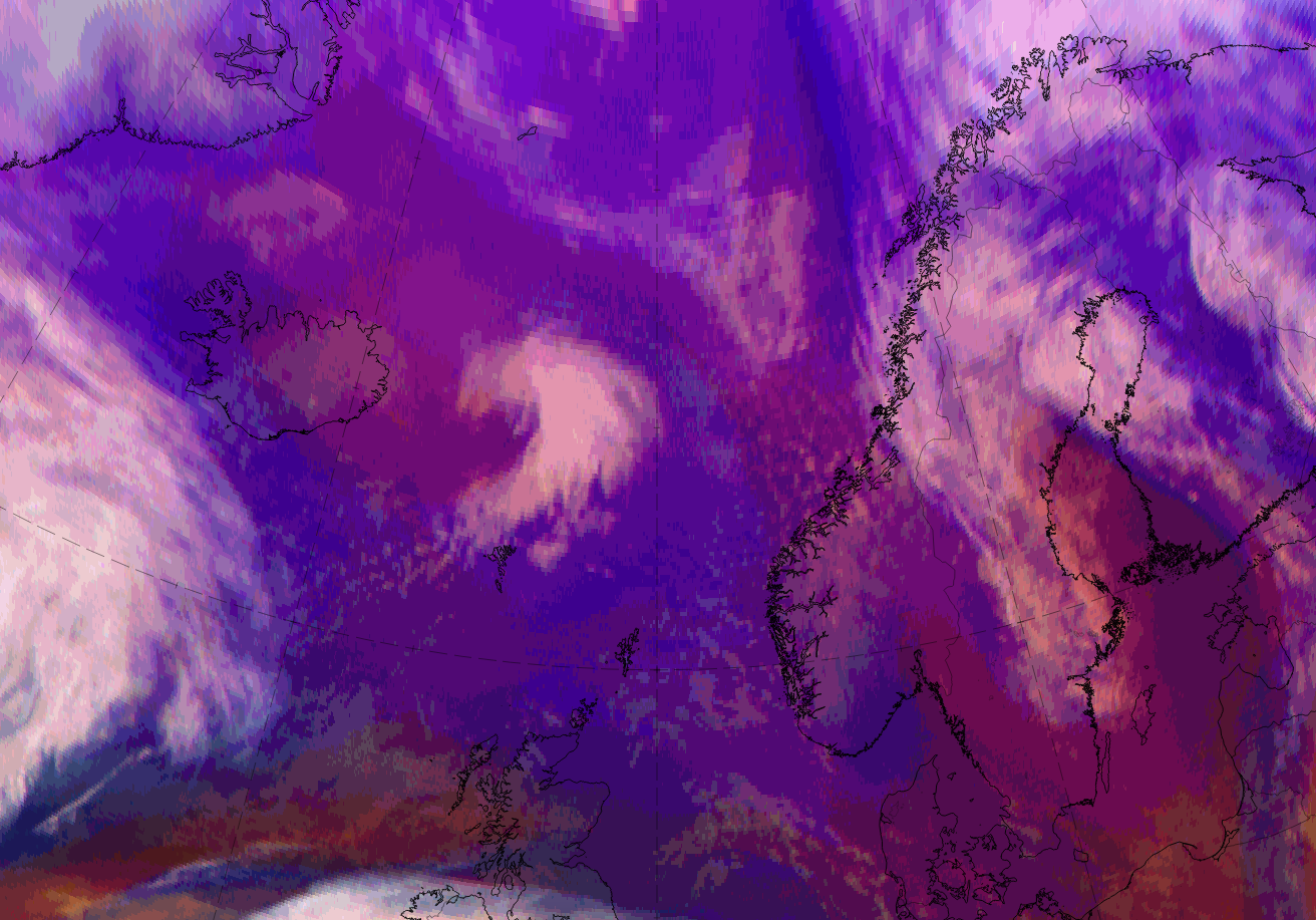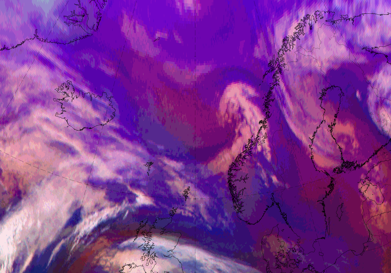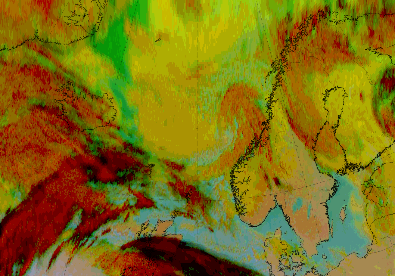 | Airmass RGB | Comma cloud embedded within dark blue colours representing the cold air behind the polar front. A dark red area behind the comma extends from the northwest to the rear edge of the comma spiral and represents the stratospheric, drier air. The comma cloud is overlaid by the dry air, hence the (usually white) clouds appear to have reddish colours. |