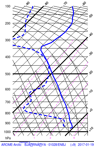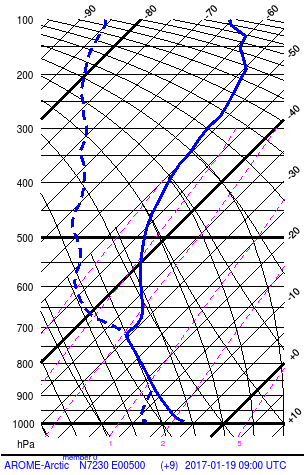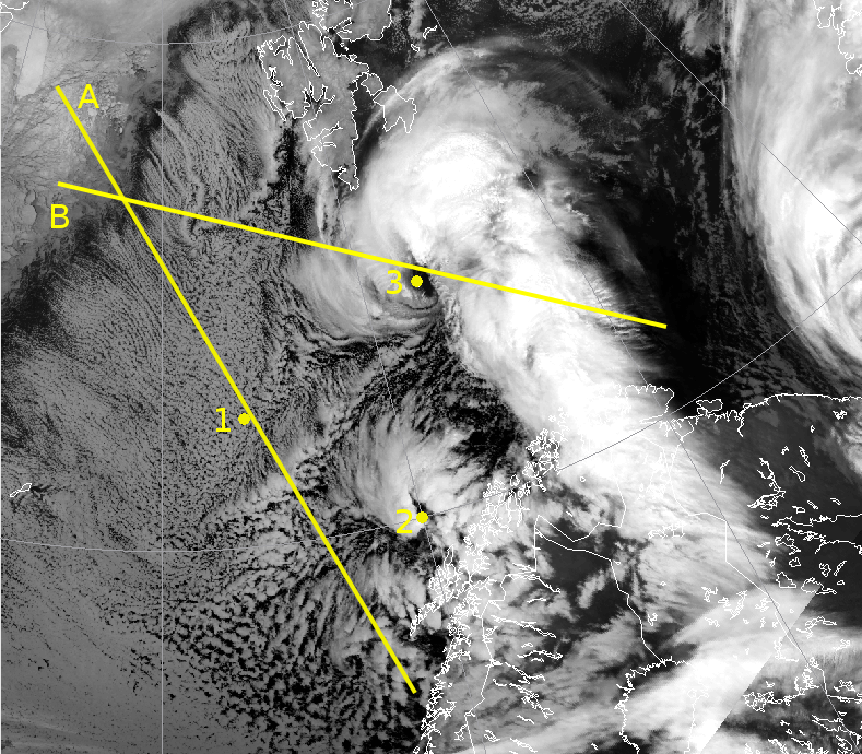 Figures 2.1a-d shows an example of a Polar Low and a cold air outbreak from 19th of January 2017 at 09Z, as seen with 0Z run from the Arome-Arctic 2,5km NWP model used at MET-Norway: In the upper left figure is the plain IR image, with cross sections and sounding points indicated. The main center is lying directly over Bear Island, and is moving in an easterly direction. The CAO is from the Fram strait west of Spitsbergen and the East Greenland ice cap. As the air leaves the ice, there is initially homogeneous convection with tops gradually increasing downstream. Approaching the Norwegian coast there is a cluster of enhanced convection and a small Polar Low. The upper right image shows the corresponding impression in the MSLP; a well defined closed low center, in this case almost symmetrical. The pressure pattern implies a strong northwesterly winds from the Greenland ice and an ongoing CAO.