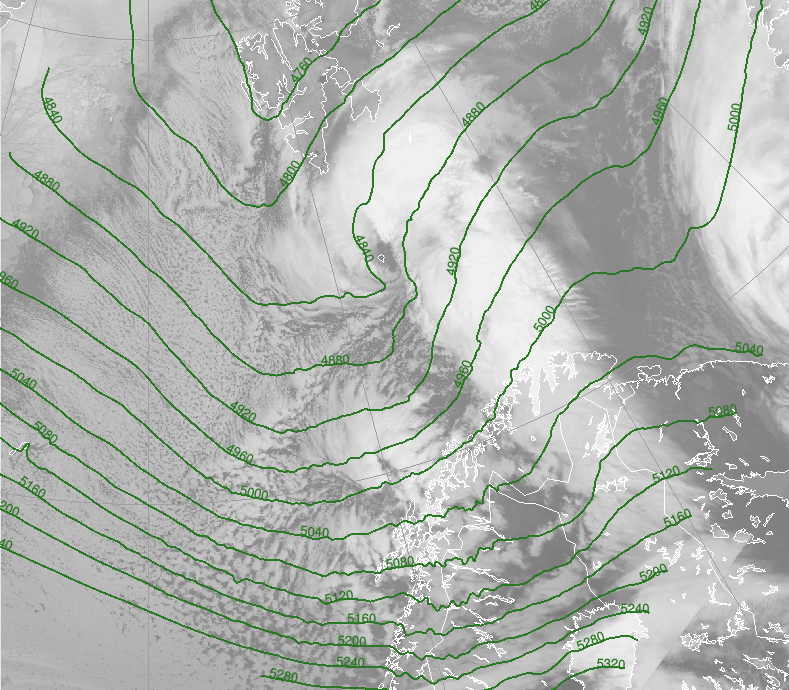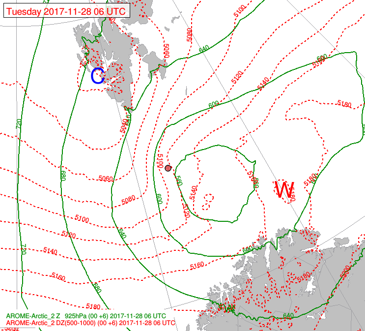 Left image shows the geopotential in 925 hPa (green) and 1000 - 500 hPa thickness (red). In this case, the strongest gradients is in the area near Bear Island (red dot). The gradient in the thickness is in the opposite direction of the pressure gradient, hence the thermal wind acts to decrease wind with height. The right image shows the corresponding sounding from Bear Island. Wind direction and speed (knots) is given by the numbers on the far left in the sounding. In this case, the strongest wind is found at 900 to 950 hPa.