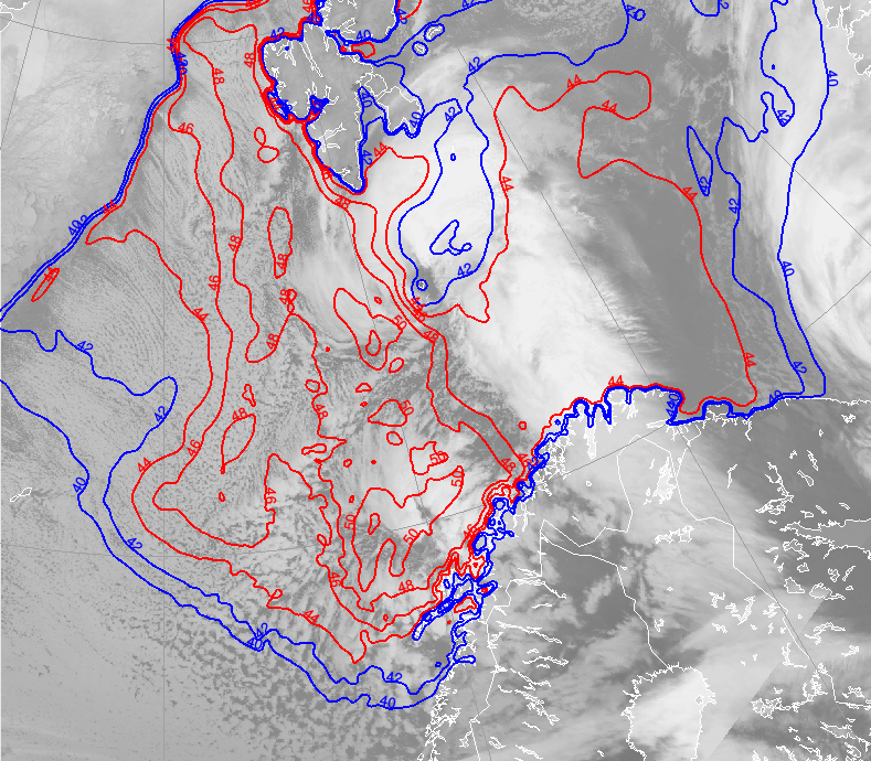 Because of the significance of the SST, to identify the cold cores that favor growth of polar lows it is more useful to consider the difference between SST and the temperature at 500 hPa. In earlier years when the location of the cold cores was uncertain, it was common to consider the max value of this difference, and a threshold of 44°C was used to indicate an area prone to PL development. In recent years, and especially when using the SST - T500 difference e.g. for automated tracking, the difference is taken in the same gridpoint. In such cases a lower value must be used, and 40°C is now considered to be the most appropriate.