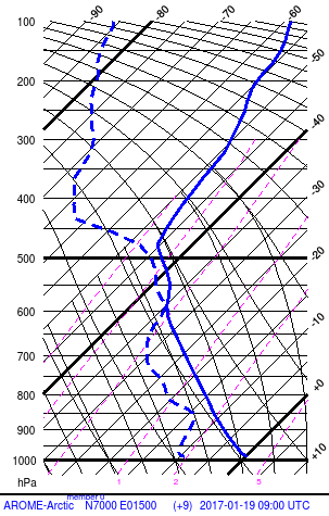 Figure 2.4 shows the cross section B through the polar low. The inversion is broken down around the center (east of 14E), and the moisture and clouds are transported up by convection to the tropopause at 7 km (400 hPa) height. The sounding at point 3 is at the center of the main Polar Low. The air column is unstable up to the tropopause at 400 hPa, and typically polar lows form in air masses where the tropopause is between 500 and 400 hPa. Comparing to the sounding at point 2, we see that the air mass above 500 hPa is colder at point 3, - there is an upper cold core present.