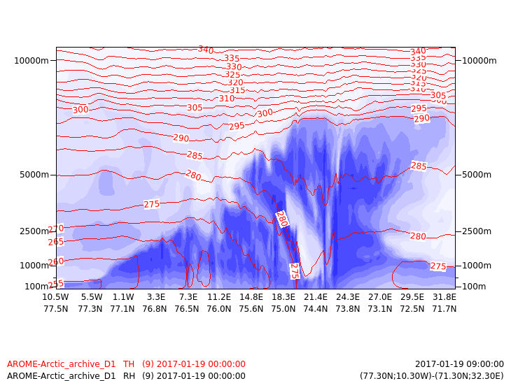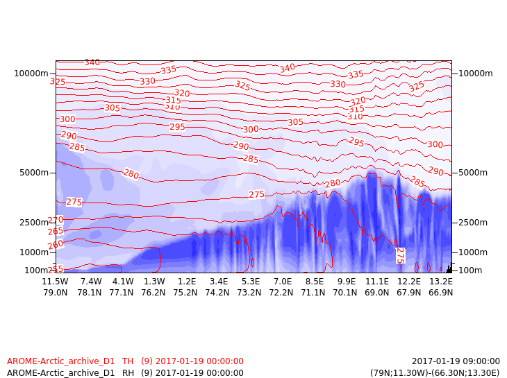Figure 2.3: Cross section A across a CAO with moderate vertical extent. Red lines are potential temperature. Blue shading are relative humidity. Illustration: Noer/MET