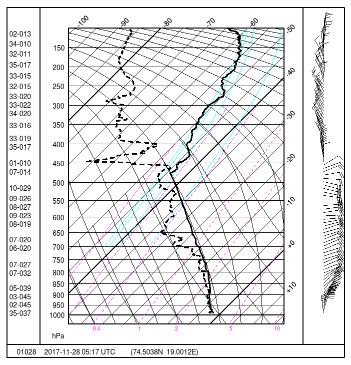 The sounding in point 2 is taken slightly northeast of line A, at an area with more deep convection. The main inversion here is at 6 km (500 hPa), consistent with the small polar low forming here. A lesser inversion at 600 hPa is at the same level as the top height of the MML seen at the southeastern end of line A. As can be seen from the cloud mass of the satellite image in figure 2.1a, this slight inversion is sufficient to stop the convection from reaching higher.
