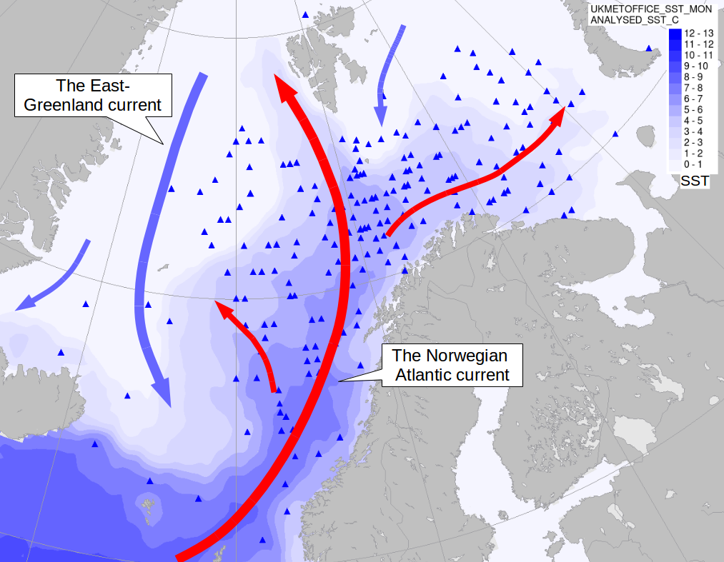 Figure 2.6: The genesis areas of polar lows from 2000 till 2017 plotted as triangles. Blue shading is monthly mean sea surface temperature in February (UK MetOffice). Also shown are the main ocean currents in the North Atlantic, showing the sourced of warm and cold water in the area. Illustration: Noer/MET