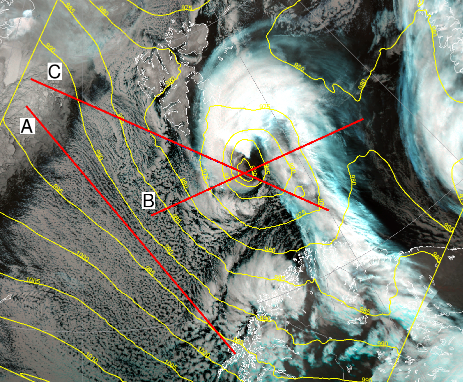 Convergence lines forms where air masses meet, and these are prone to intensify into polar lows or other deep convection. In figure 1.3 a mature CAO is shown extending from Greenland till Novaya Zemlya. The wedge shape of Spitsbergen is particularly effective in modifying the flow to converge in the areas around Bear Island.
