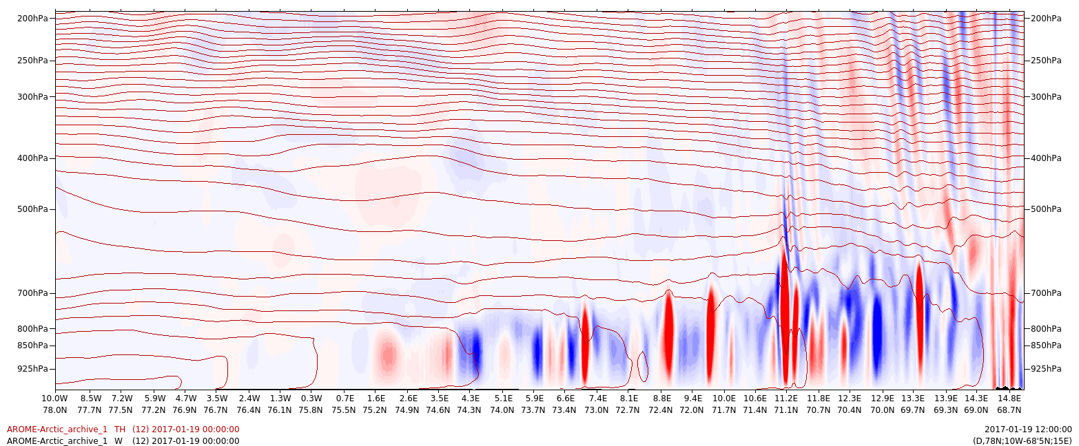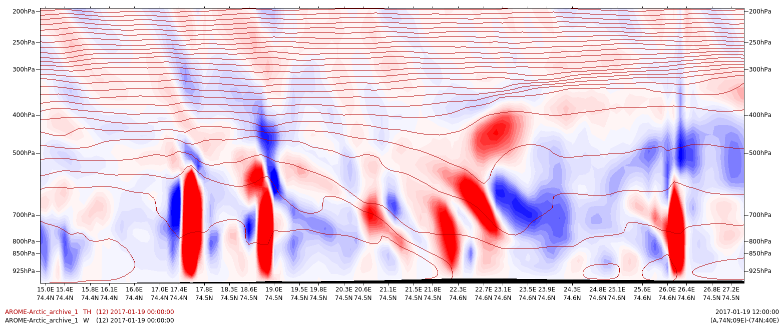 Figure 4.3: Shows potential temperature (dark red lines) and vertical speed (blue/red shading for +/- ω) along line A through the cold air outbreak to the west of the polar low. Illustration: MET-Norway