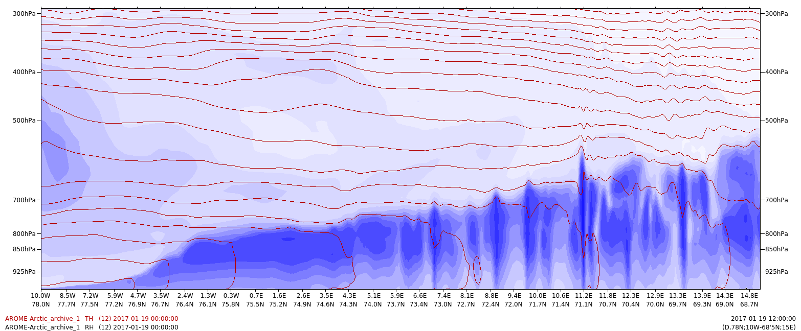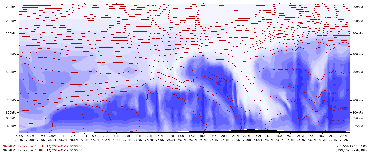 Figure 4.5: θ (dark red) and relative humidity (blue shading) along line A, along the cold air outbreak but west of the polar low: Illustration: MET-Norway