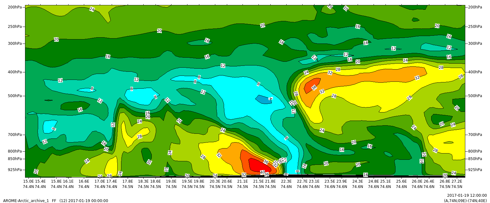 Figure 4.6: shows a similar plot along line C from the Greenland east ice through the polar low, located between 19E to 27E. Illustration: MET-Norway