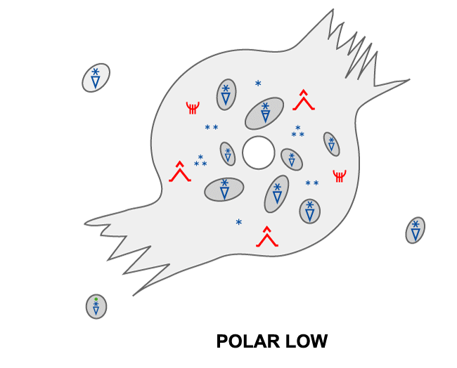 A polar low usually forms as a consequence of both baroclinic and static instability, the latter being almost unobstructed from low levels and up to above 500 hPa. In addition, also PVA at upper levels needs to be present. In the developing phase, the following elements are most common: