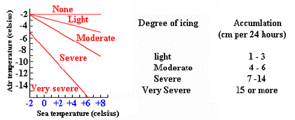 The chart (Mertins 1968) below shows a simplified graphic over vessel icing in gale force winds (Beaufort 8). Icing naturally increases with wind speed and wave height, the latter increasing with the distance from the ice edge.
