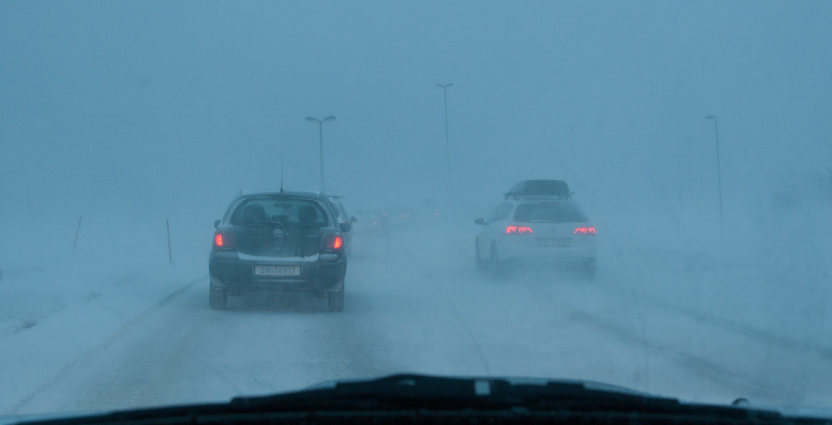 Figure 5.4: A combination of wind, windblown snow and and heavy snowfall gives severely reduced visibility and often very difficult driving conditions as Polar Lows make landfall. Disruption of both marine and air traffic is common. Photo: Gunnar Noer