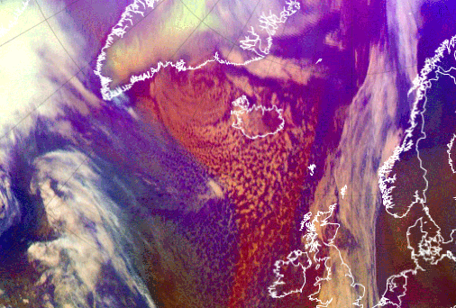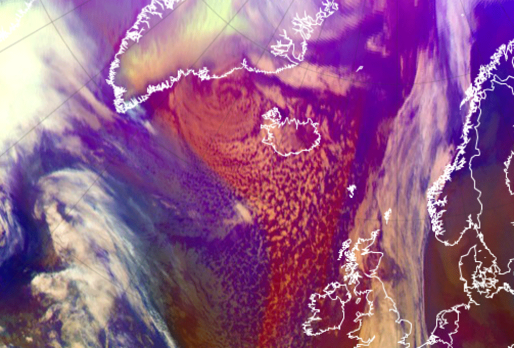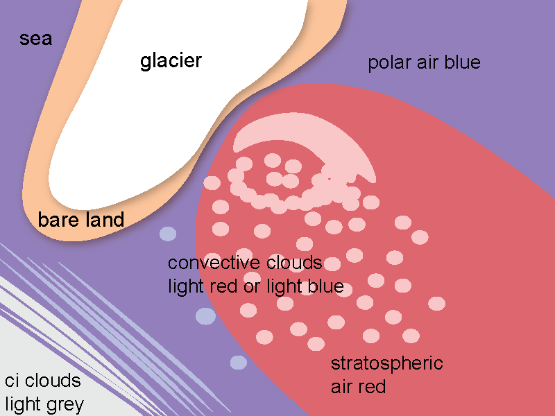 Piteraqs occur in a certain synoptical environment: a low pressure between Iceland and Greenland is moving westward.The low pressure can be an occluded cyclone, a polar low or a large and intense comma. Polar lows and commas occur within cold polar or arctic air masses, whereas occluded cyclones are situated within a very dry and cold airmass originated from the lowest layer of stratosphere. The Meteosat Airmass RGB image from 16 Feb 2015 below shows not only the clouds, but also the cold air mass. The very cold and dry stratospheric air is seen reddish within blue polar air.