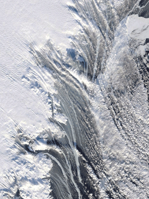 Cold, dry katabatic winds cannot be seen as such in satellite images. They can be sometimes detected, however, in very high resolution visual images as white tendrils of drifting snow over the dark sea, or as trails of foam on the crest of the waves.