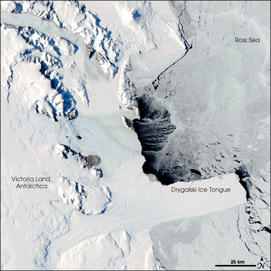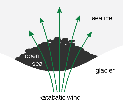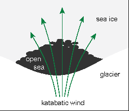 Katabatic winds in northern Greenland, and especially in Antarctica, can also cause a phenomenon called Coastal Latent Heat Polynia.'Polynia' means a pool of water surrounded by ice. Polynias can be seen in very high resolution visual images as black areas surrounded by white/grey ice and snow.