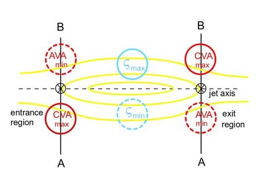 The jet axis, described mathematically by the line of zero shear vorticity in the upper levels, extends along the rear side of the cold front cloud band approximately to the south and south-western edge of the wave cloud bulges, in the Wave and Intensification stages. Such wind fields are, because of their inherent shear and curvature, accompanied by cyclonic vorticity and cyclonic vorticity advection (CVA). Maxima of CVA can be found in the centre of the cloud spiral in the Mature and Dissipation stages.