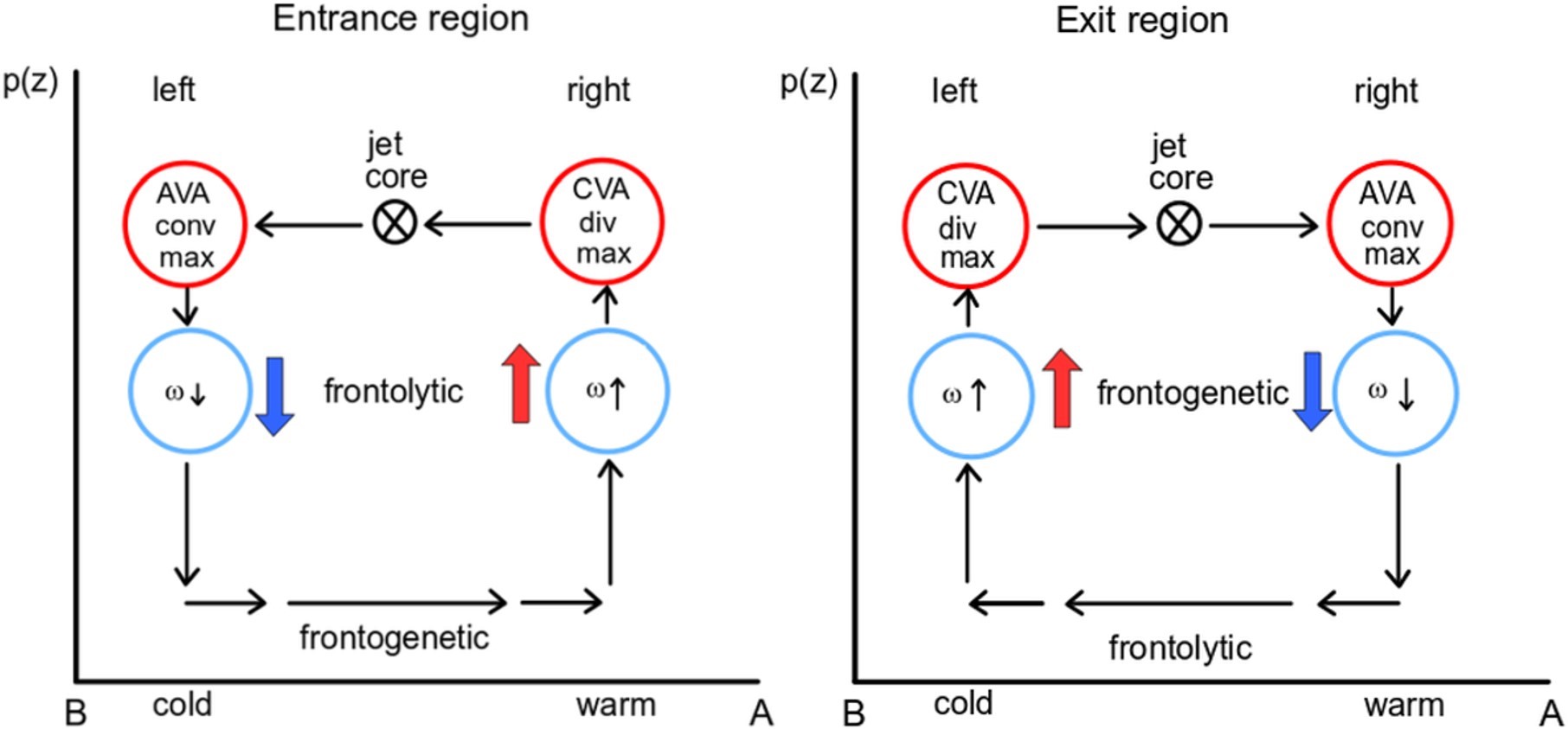 In the northern hemisphere, there are two areas in a jet streak that are preferred areas for cyclogenesis: the left exit region and the right entrance region. For secondary cyclogenesis the preferred area is the right entrance region, while the left exit region is associated more with rapid developments (Rapid Cyclognesis).