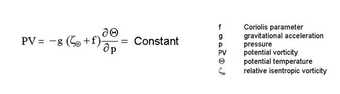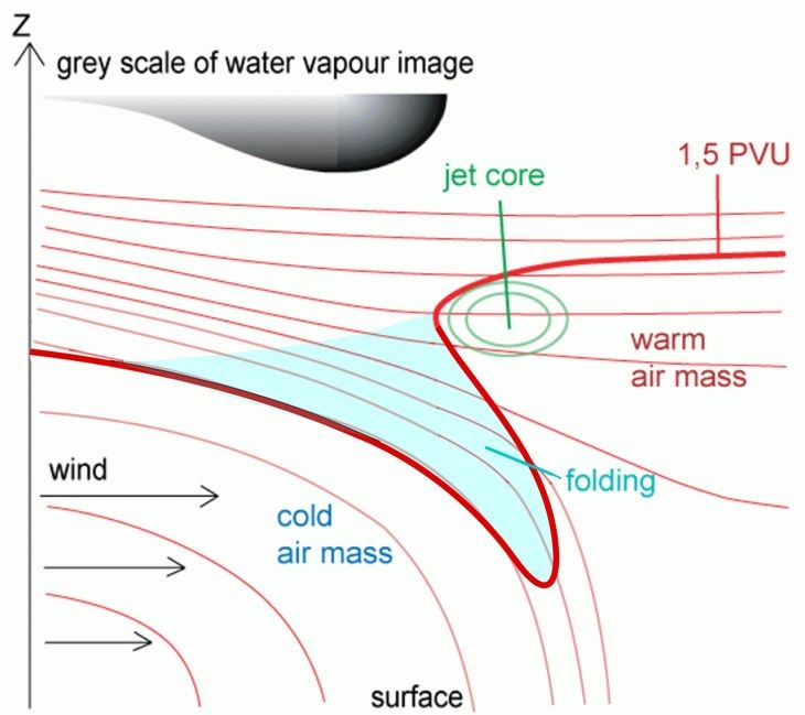 A consequence of tropopause folding is the downward protrusion of stratospheric air into the troposphere. A parameter that describes the qualities of stratospheric and tropospheric air masses very well is Potential Vorticity (PV).
