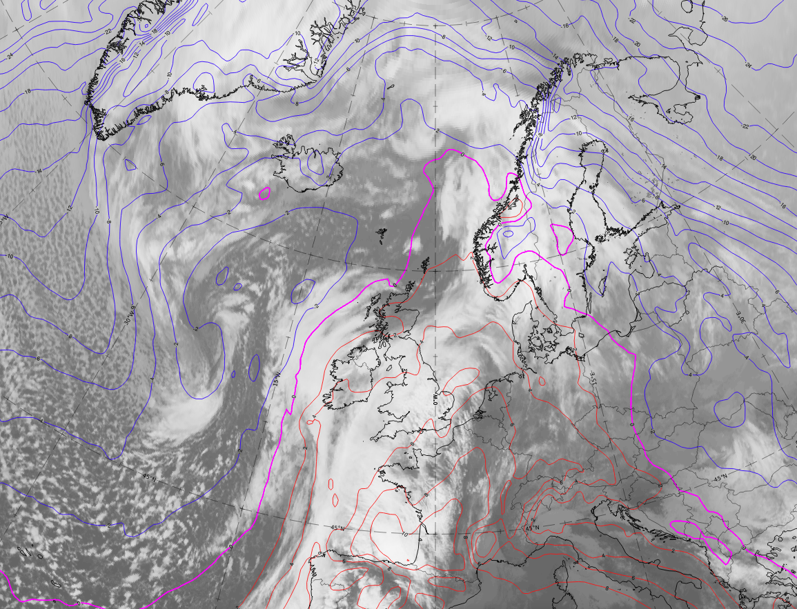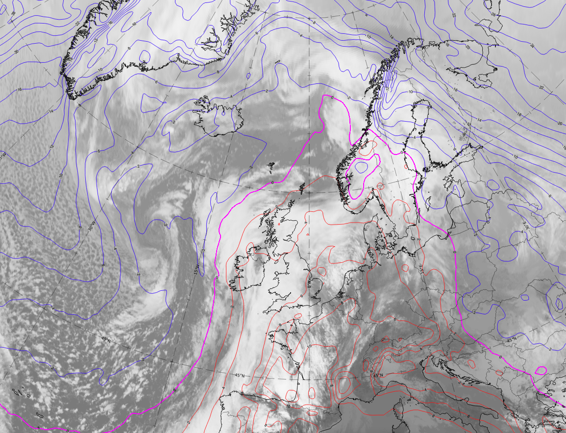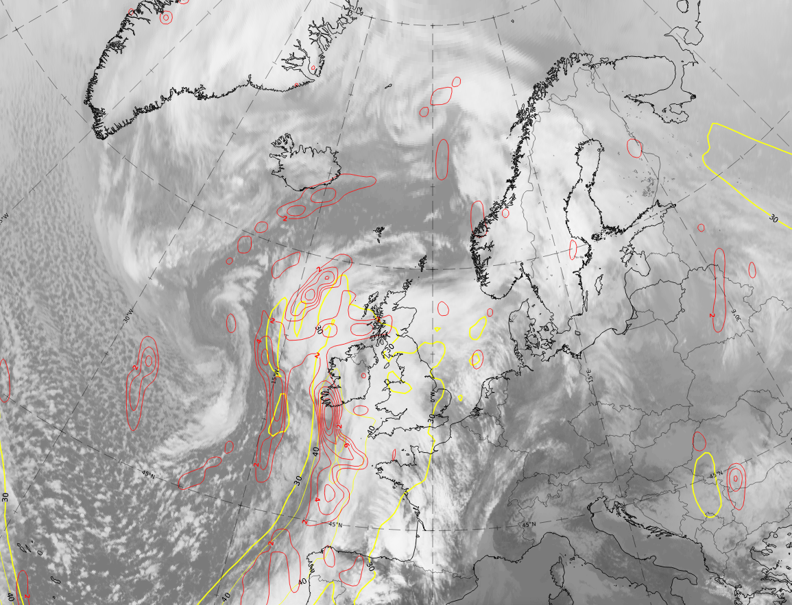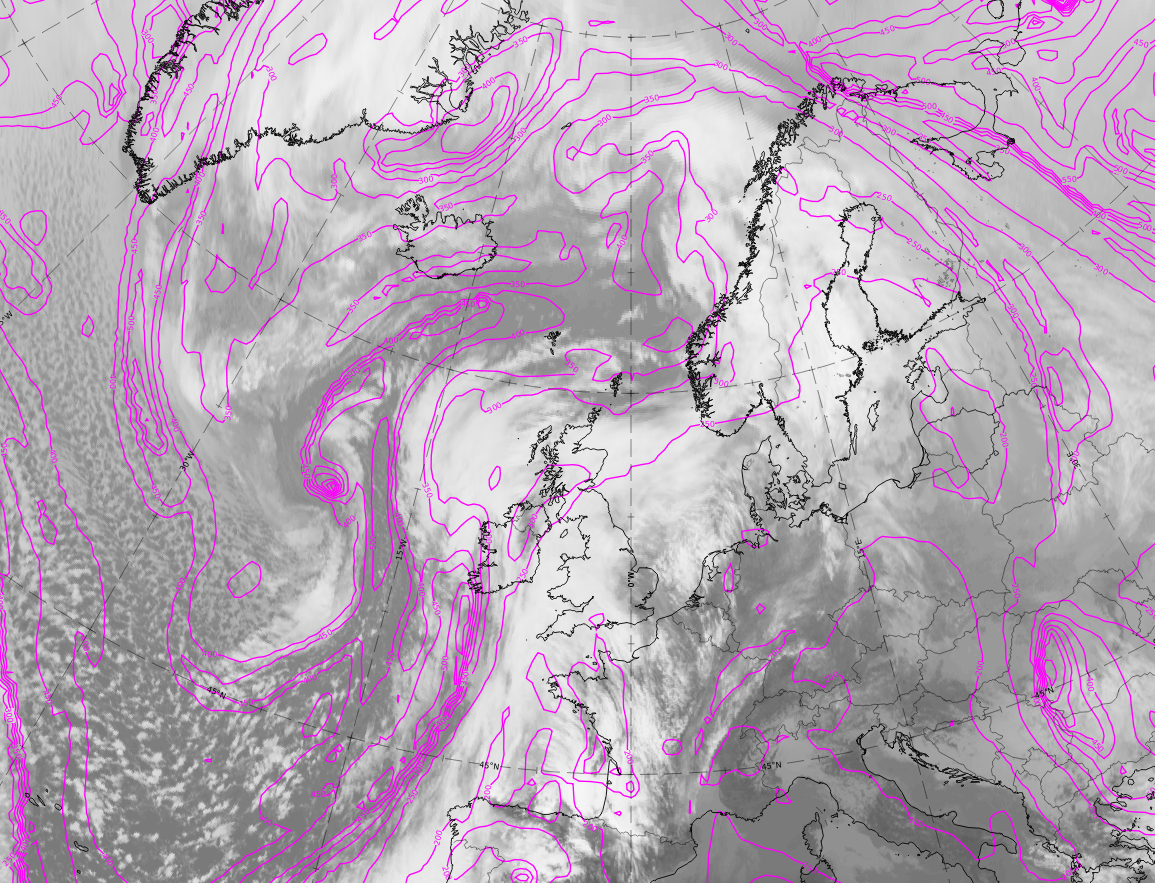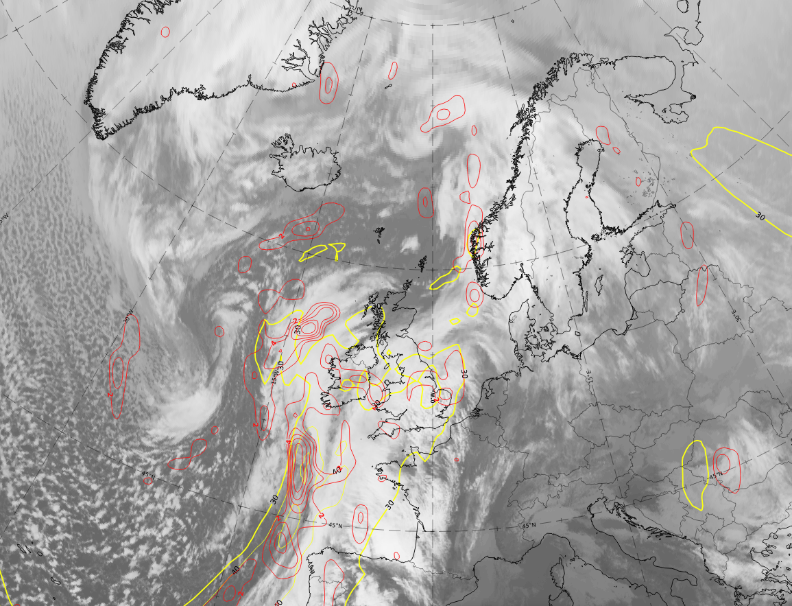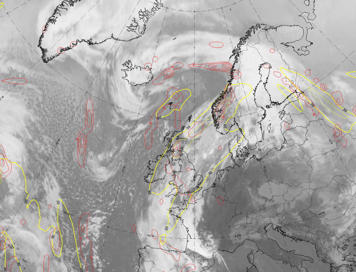 The isotachs in yellow show the typical jet streak along the rearward edge of the cold front cloud band, in this case with a double structure, which is a consequence of the history of the case: the merging of two frontal systems. Less well pronounced in this case, is the jet streak at the leading edge of the warm front.