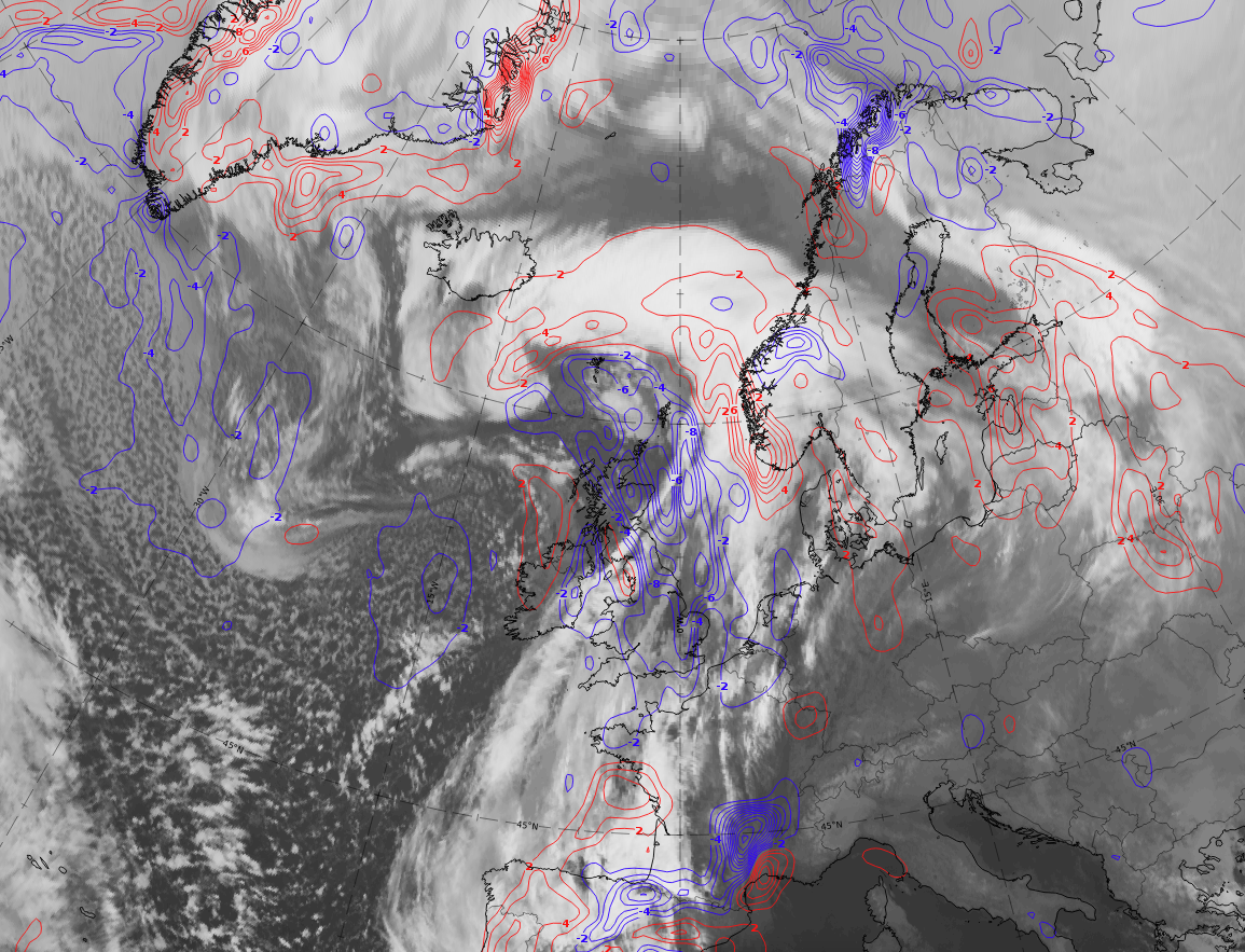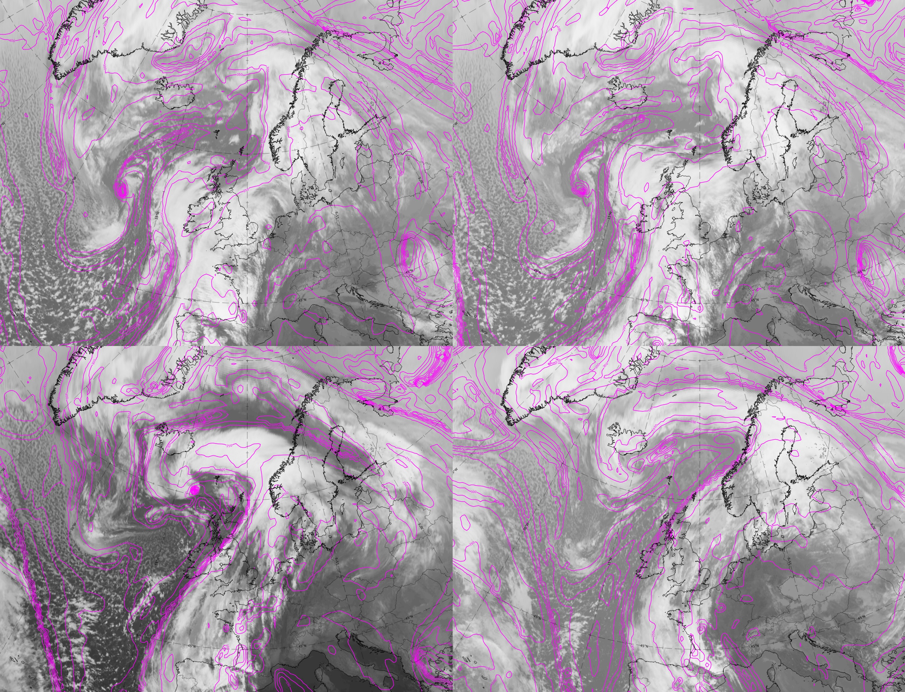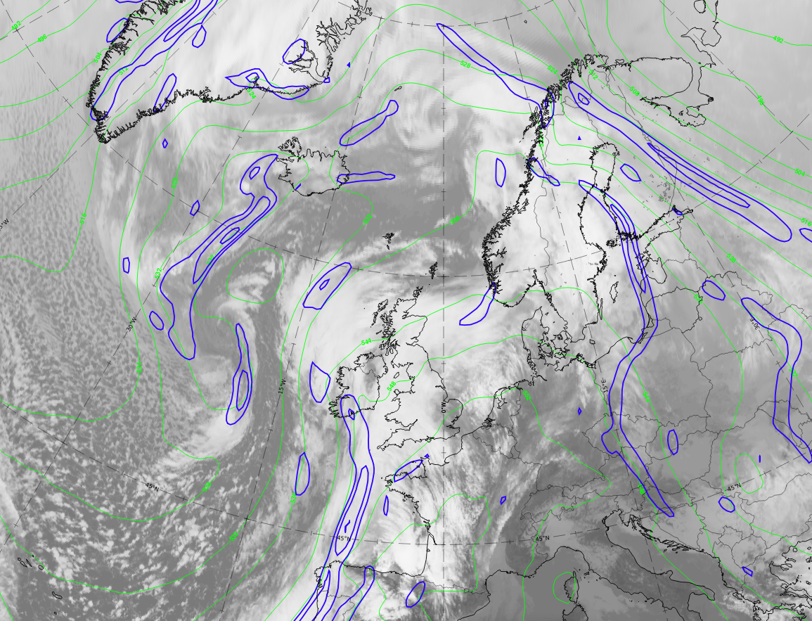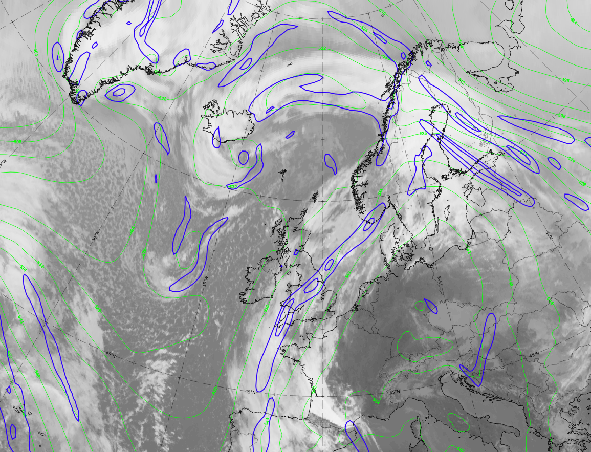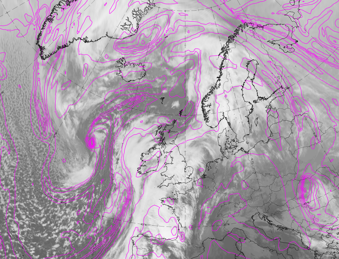 The isotachs in yellow show the typical jet streak along the rearward edge of the cold front cloud band, in this case with a double structure, which is a consequence of the history of the case: the merging of two frontal systems. Less well pronounced in this case, is the jet streak at the leading edge of the warm front.