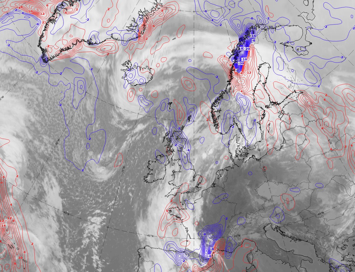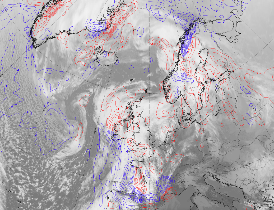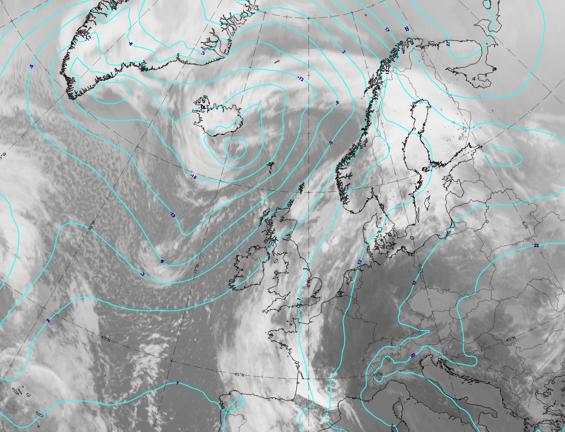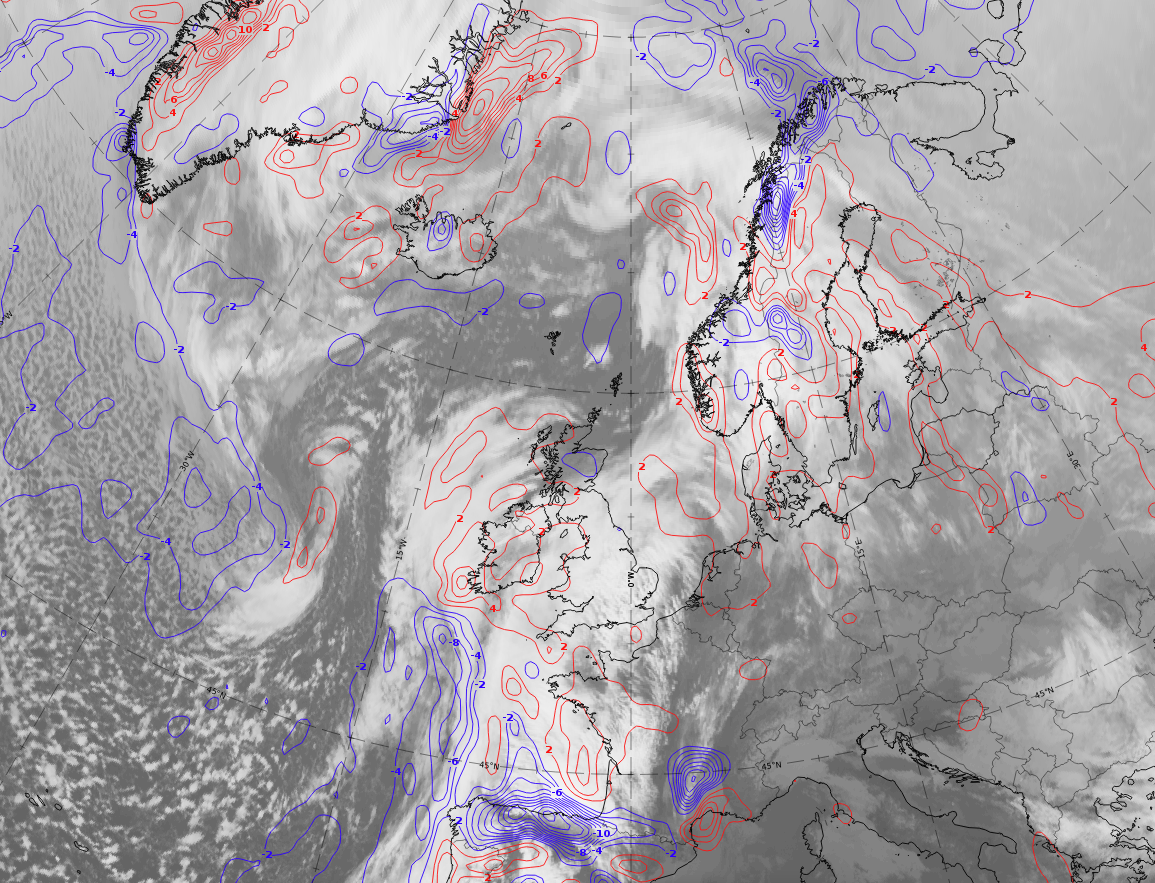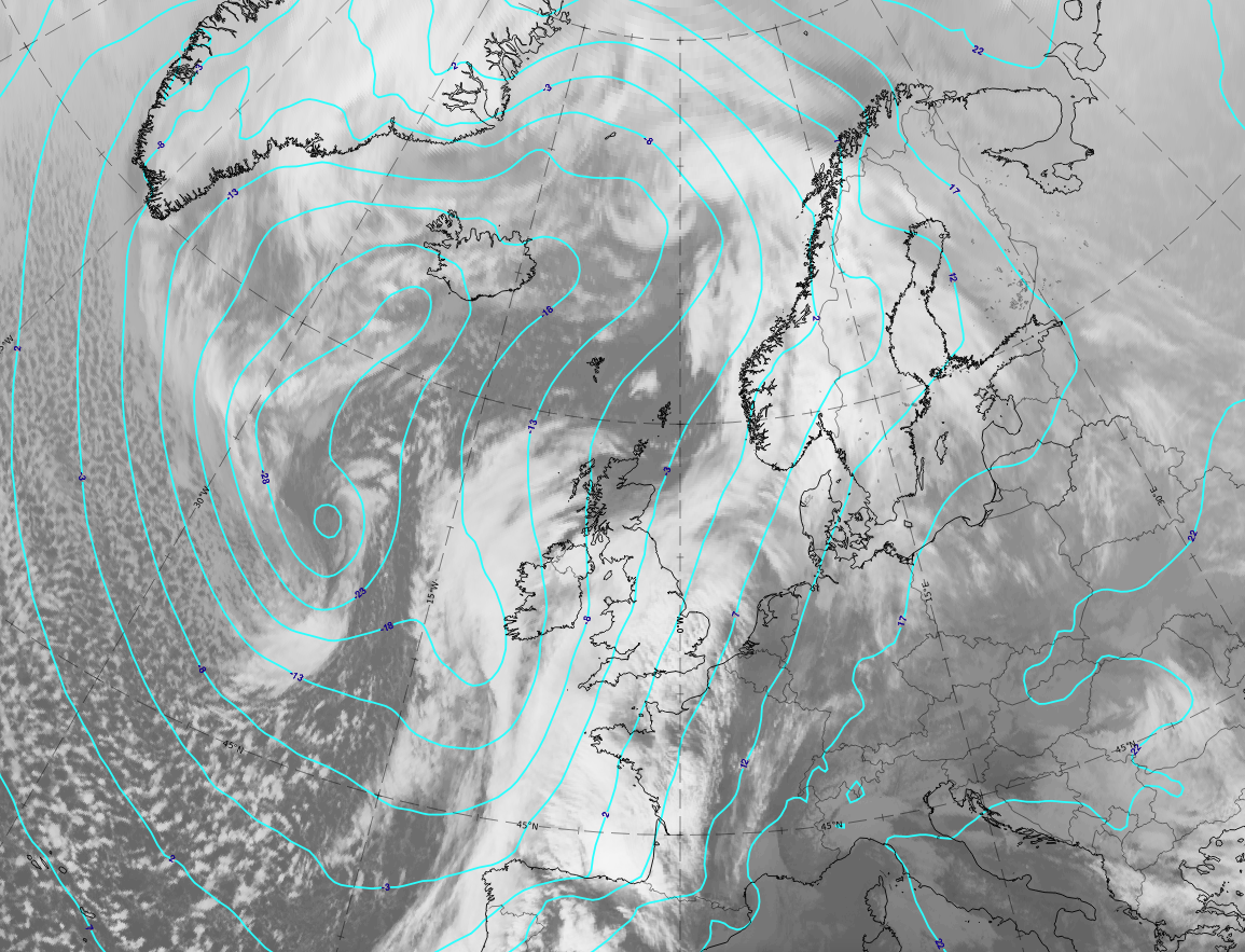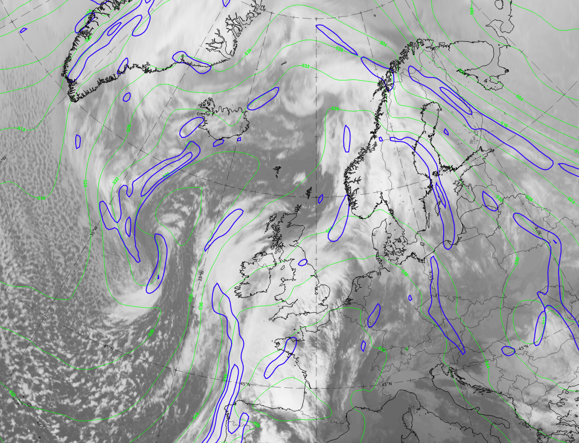 The isotachs in yellow show the typical jet streak along the rearward edge of the cold front cloud band, in this case with a double structure, which is a consequence of the history of the case: the merging of two frontal systems. Less well pronounced in this case, is the jet streak at the leading edge of the warm front.
