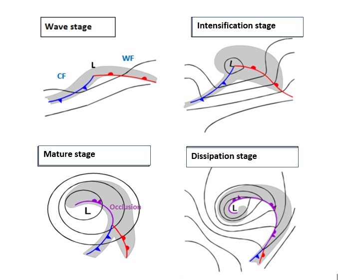 • In the Wave stage, a distinct trough can be seen in the low-level geopotential isolines in the wave area, which is characterised by the cloud bulge near the connection point between the cold and warm fronts. This trough sharpens between Wave and Intensification stages, finally forming a closed low centre.