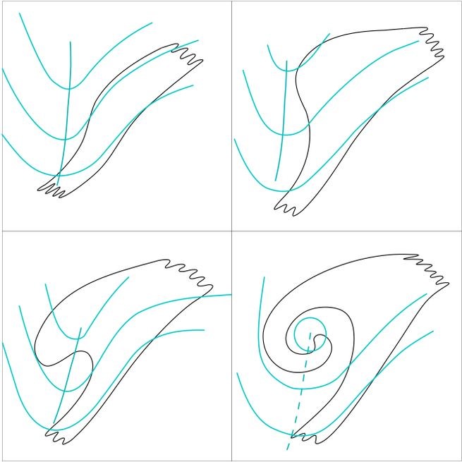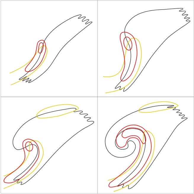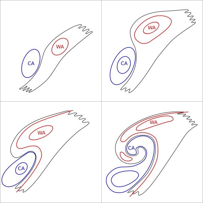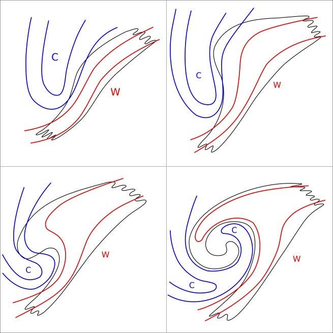 • The growing bulge of warm advection accompanying the occlusion spiral, which can be seen in this case from the Wave stage to the Mature stage.