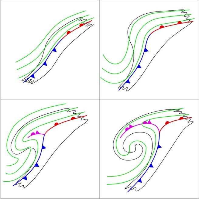 • During the Mature stage, the warm and cold advection maxima intensify further. In the Dissipation stage, the occlusion cloud spiral is co-located with the warm advection maximum, while the cold advection maximum is located in the cloud free centre of the occlusion spiral.