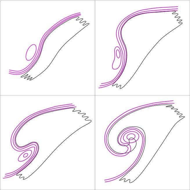U.l.: 09 UTC on 20 February 2021 Wave stage; u.r.: 12 UTC on 20 February 2021, Intensification stage; 00 UTC on 21 February 2021, mature stage; 12 UTC on 21 February 2021, Dissipation stage.
