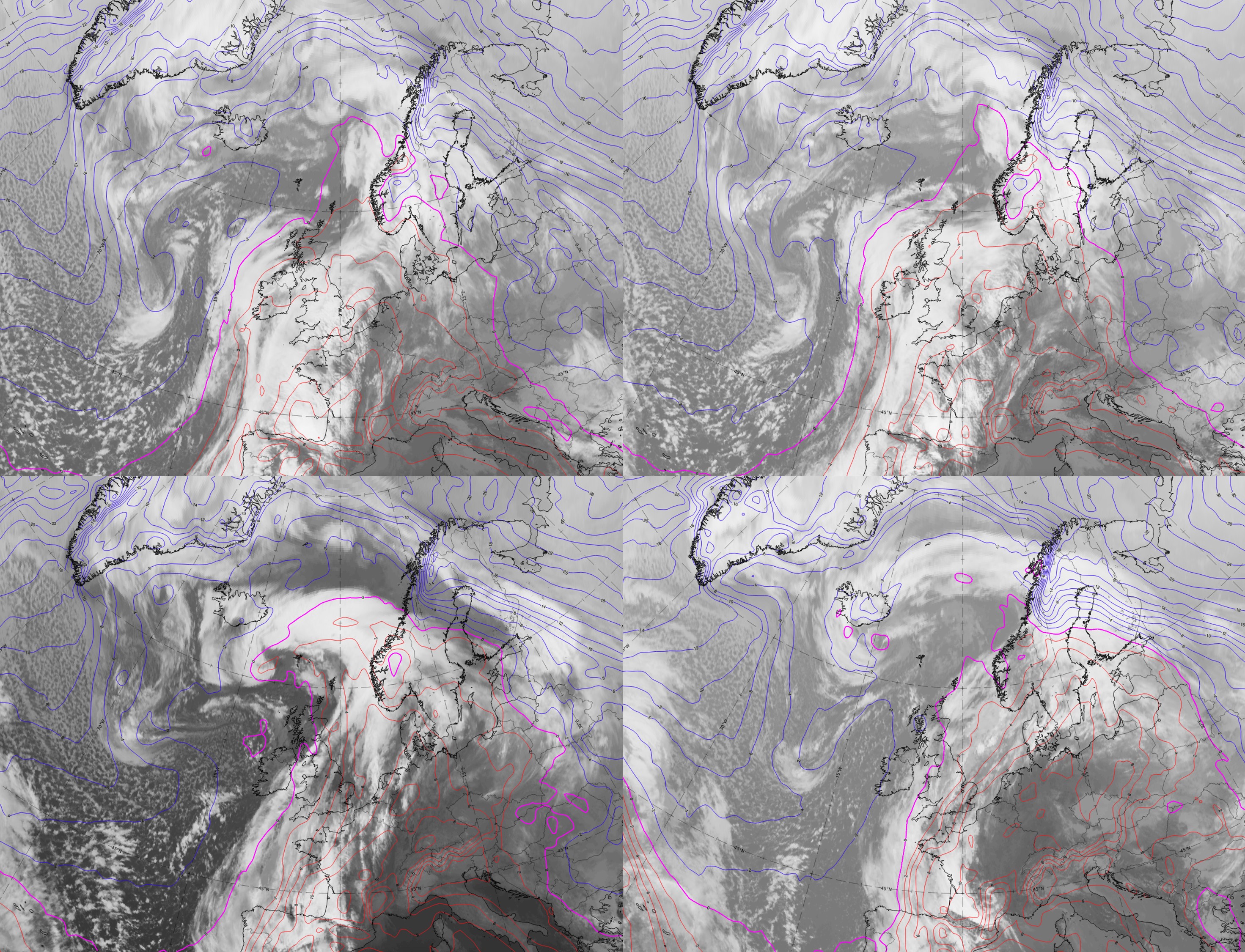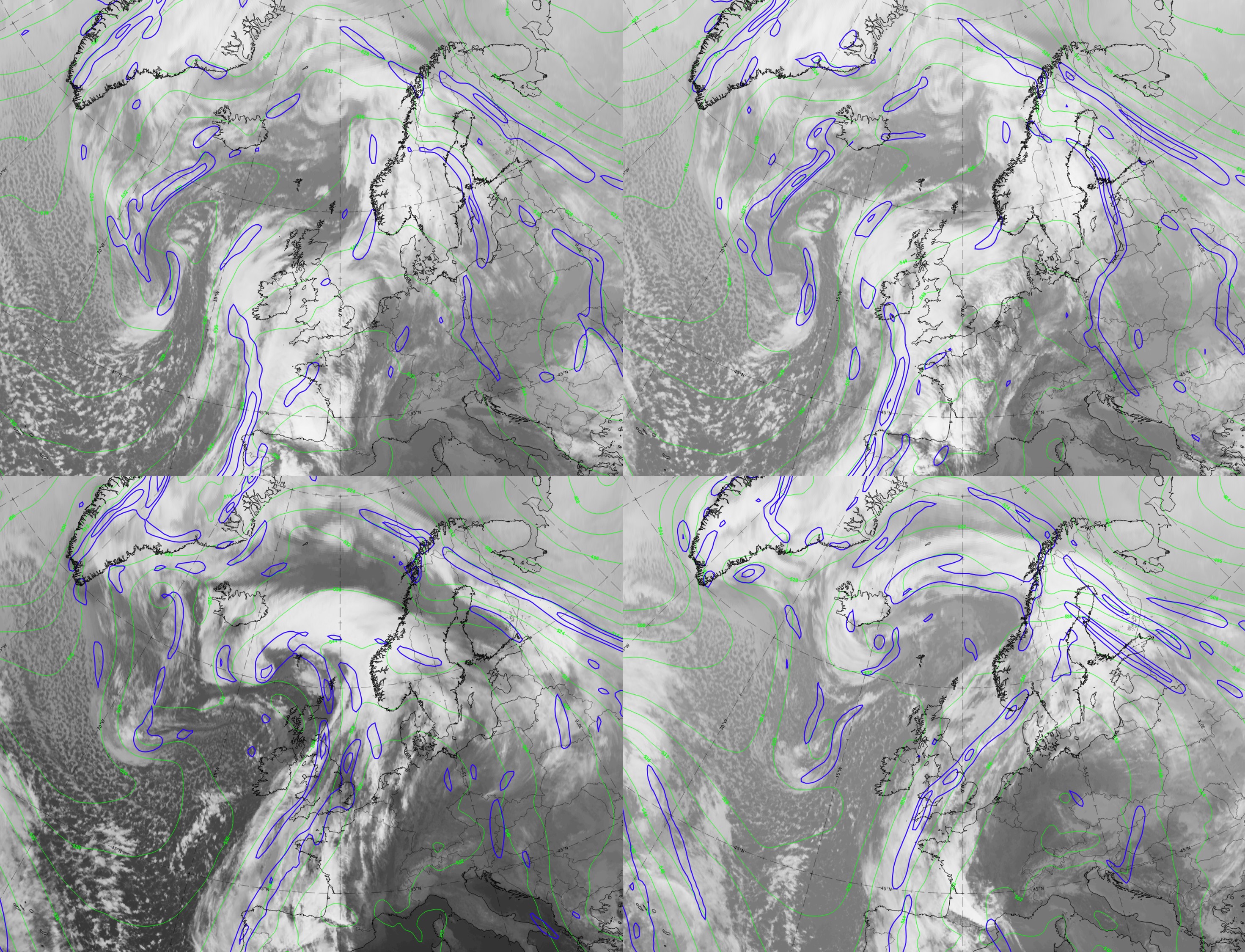 • In all four stages the difference between the high values of tropopause (where PV = 1,5 PV units) in the cloud bands and the low tropopause in the cold air behind is very clear.